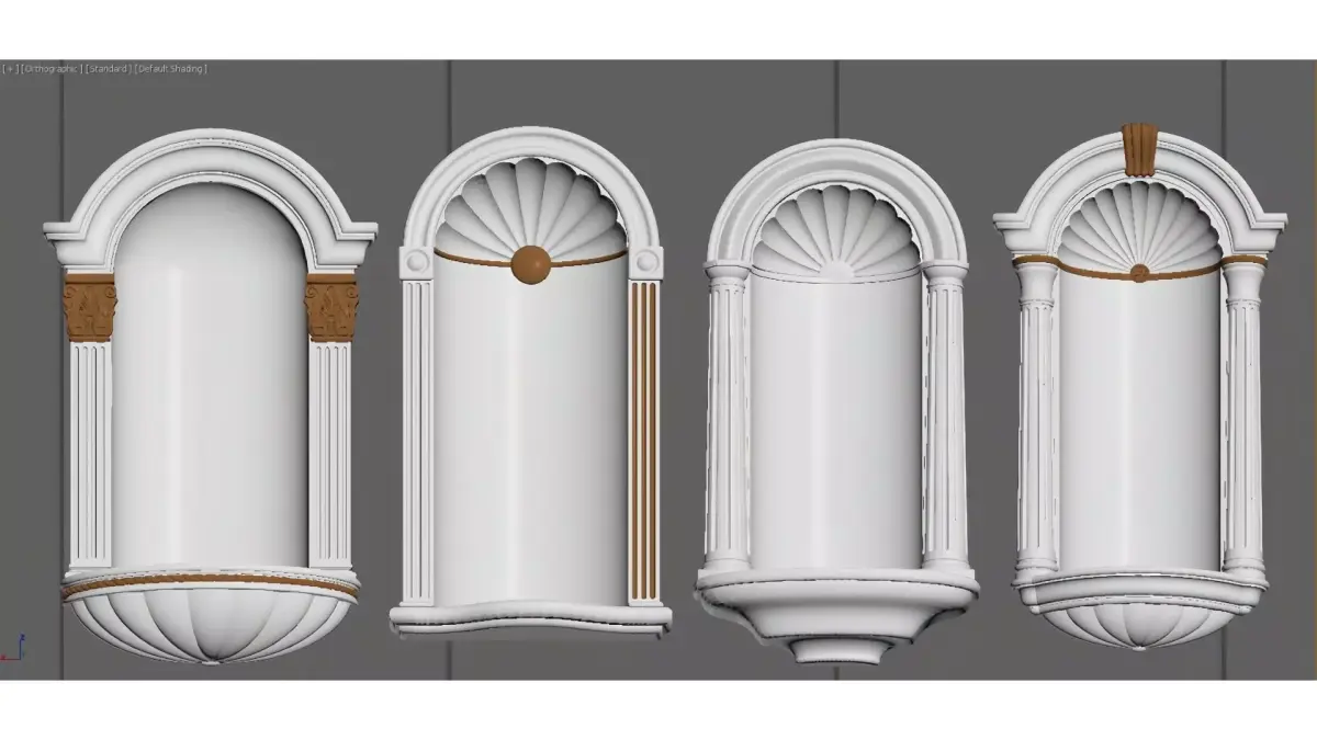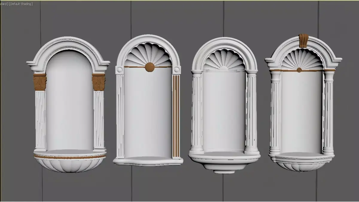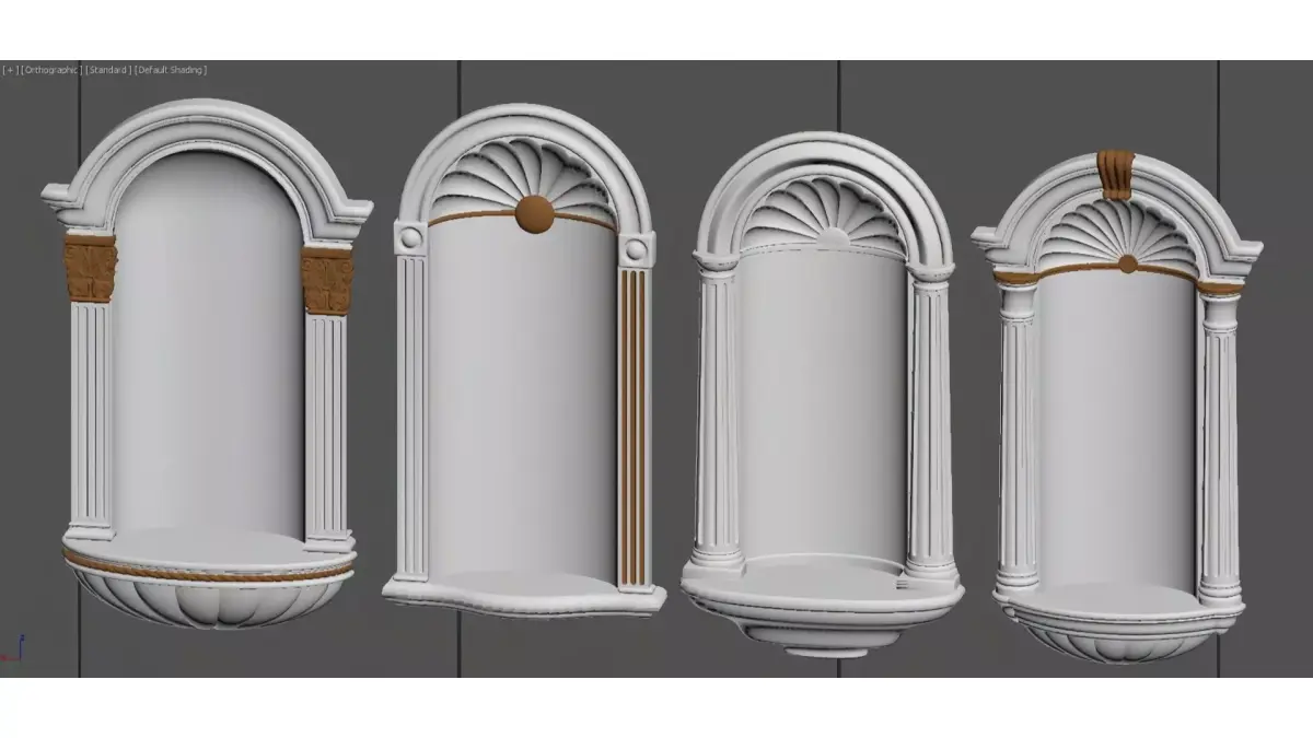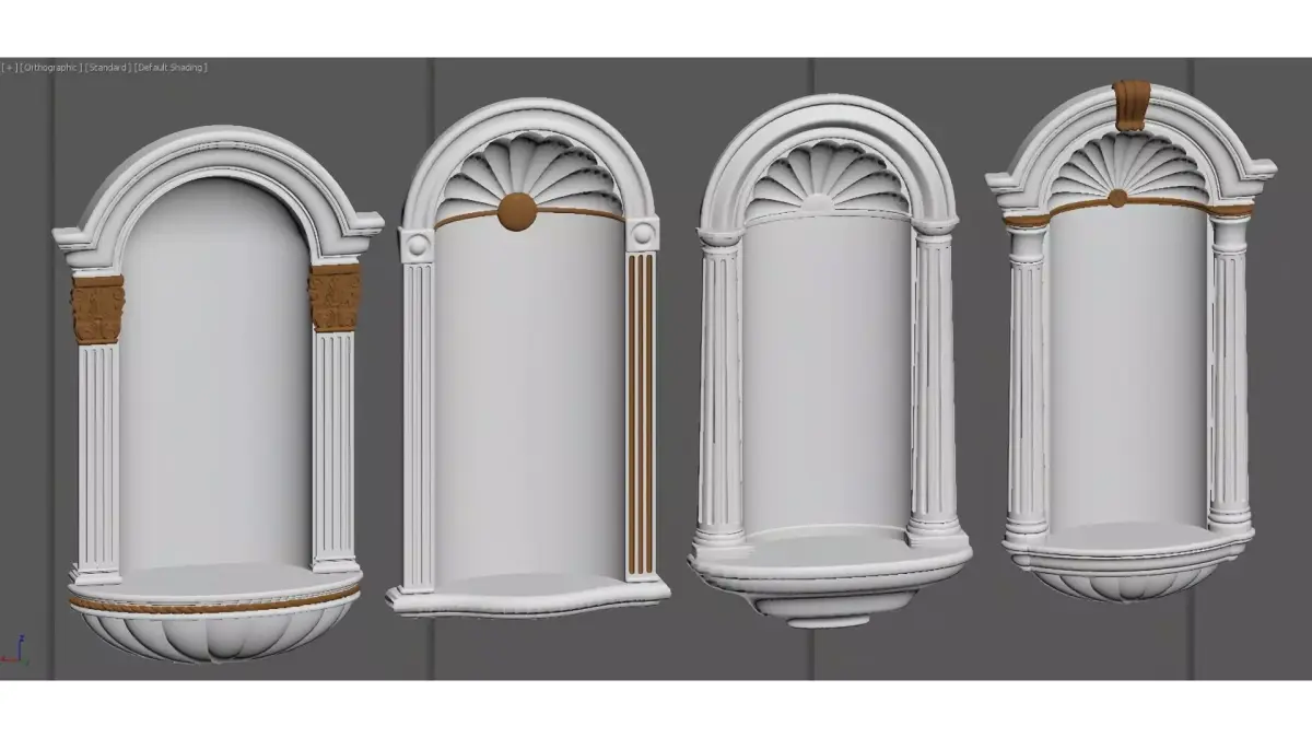 This is a set of plaster niches in a European classical style. With a pure white base and exquisite gold accents, they incorporate classic architectural elements such as Roman columns and arched lintels.The niches feature an elegant design with rich details, including symmetrical column structures and shell-shaped relief carvings. They can serve as artistic display shelves on the wall or act as the finishing touch in a space, perfectly complementing various decoration styles like light luxury, retro, and European, while adding elegance and a sense of sophistication to the environment.