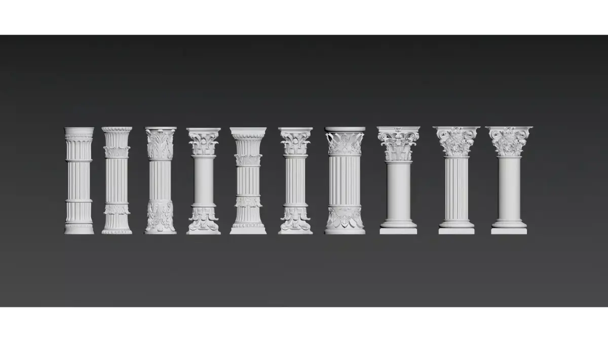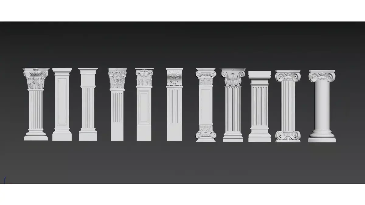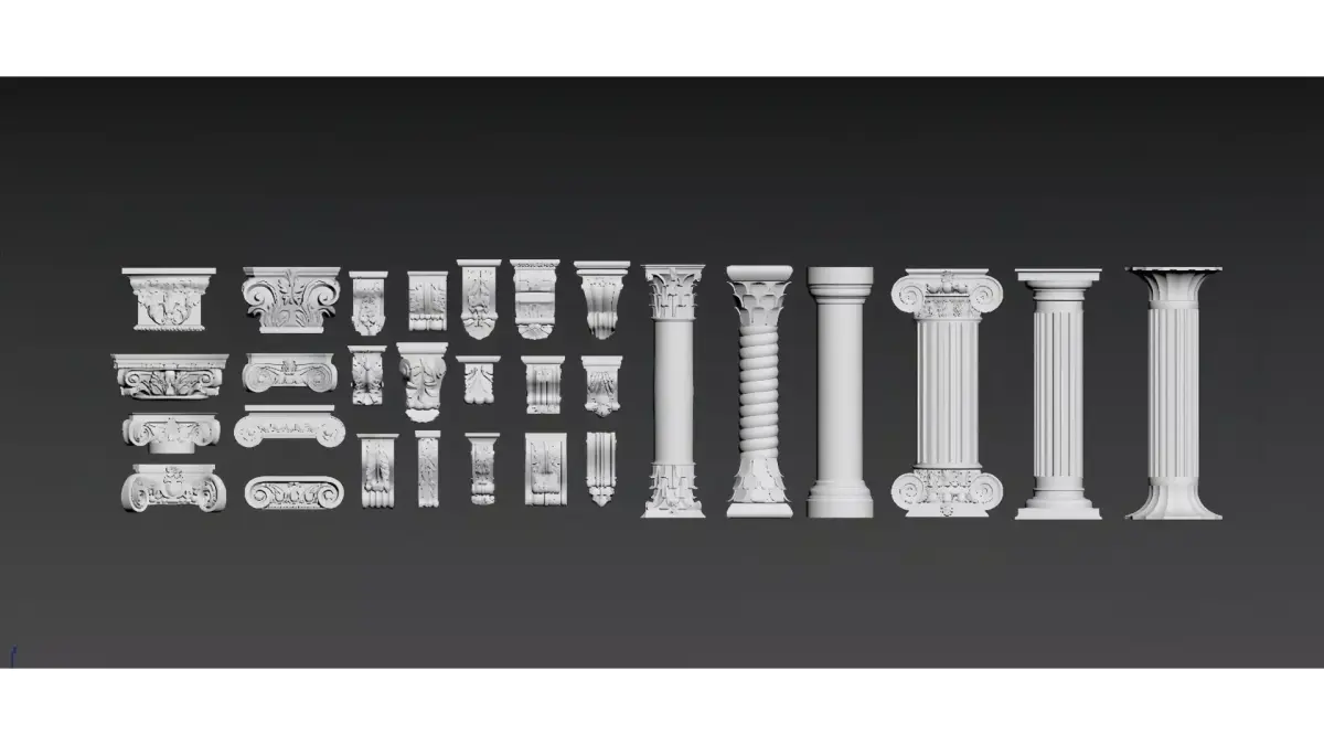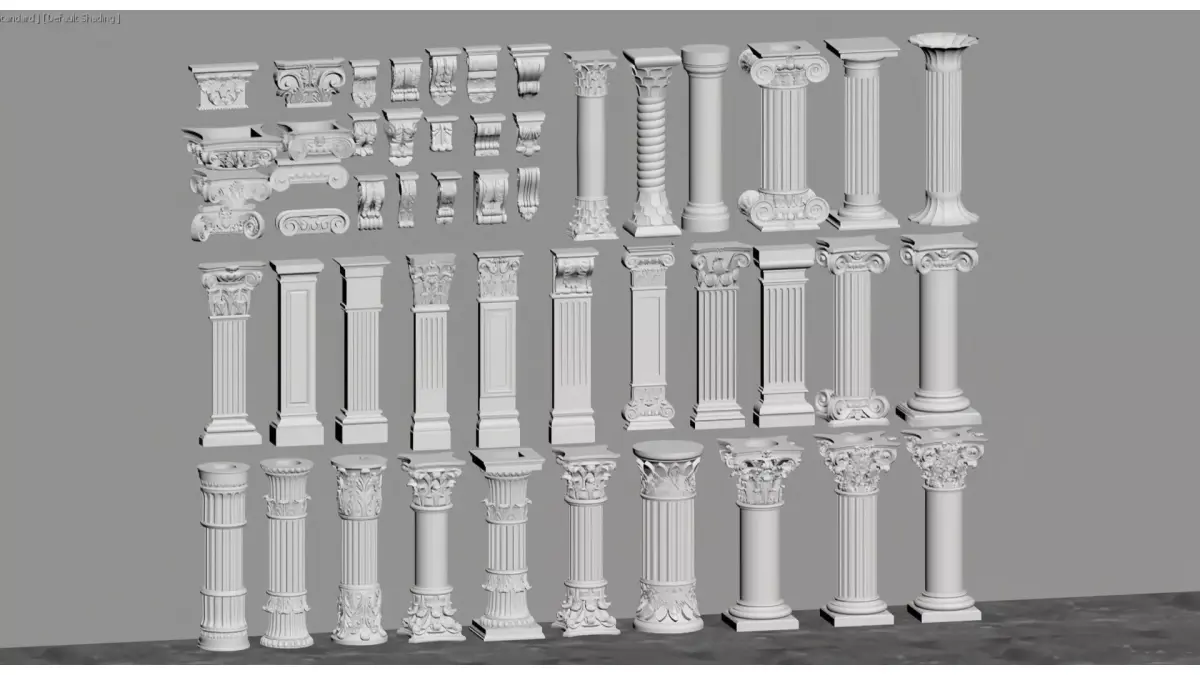 This is a set of European classical-style decorative column/roman column materials, including different styles of capitals (such as Ionic volutes, Corinthian acanthus leaf decorations), shafts (fluted, smooth, or spiral) and bases. With an overall white gypsum texture, they combine retro elegance with ornamental features. Suitable for interior soft decoration, architectural decoration design or 3D model materials, these columns present the exquisite details and aesthetic characteristics of neoclassical architecture.