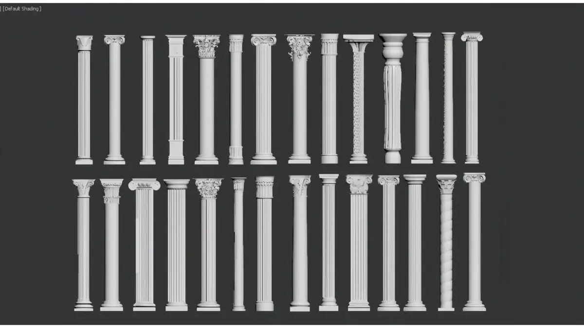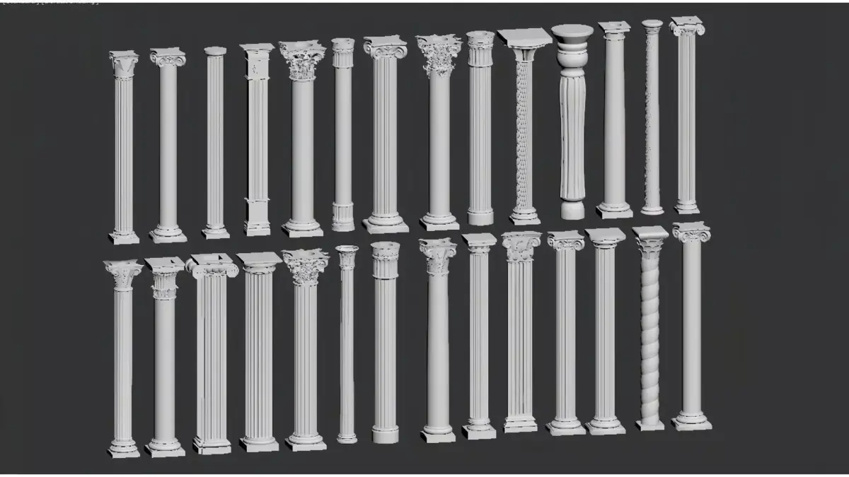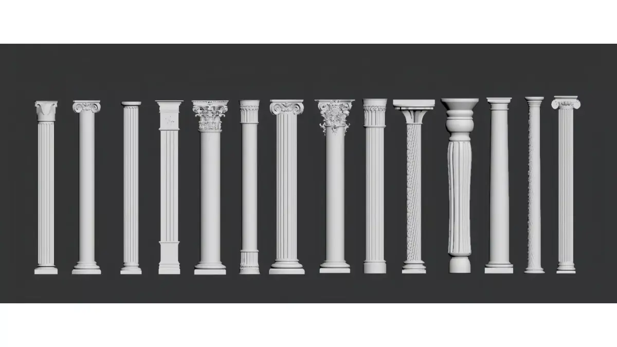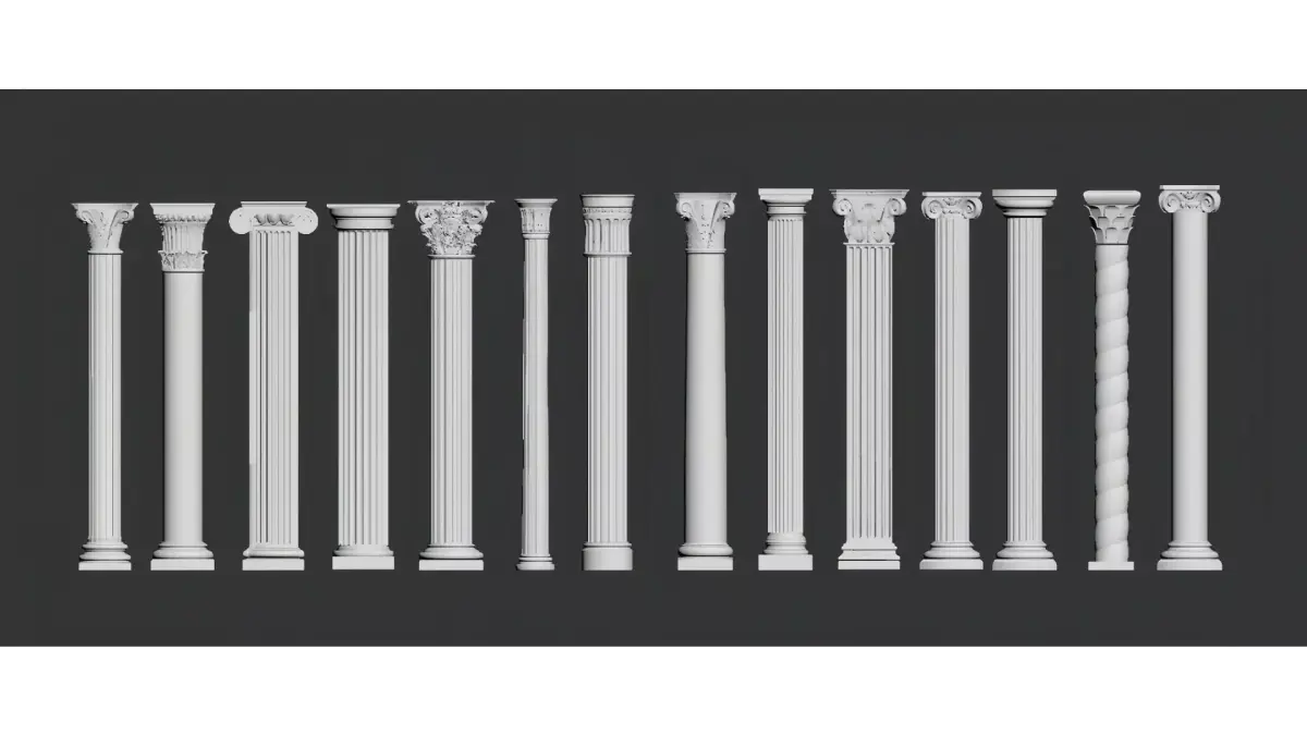 This is a collection of European classical-style decorative columns (Roman columns), including classic orders such as Doric, Ionic and Corinthian, as well as variant styles like spiral columns and carved columns.The column shafts are predominantly white, adorned with delicate fluting, relief patterns and capital decorations. They integrate retro aesthetics with ornamental functionality, and are suitable for scenarios such as European-style interior design, architectural decoration and space furnishing, showcasing an elegant classical architectural texture