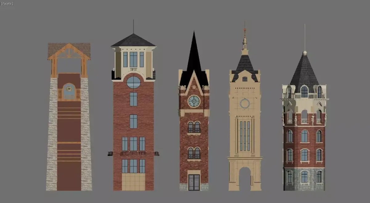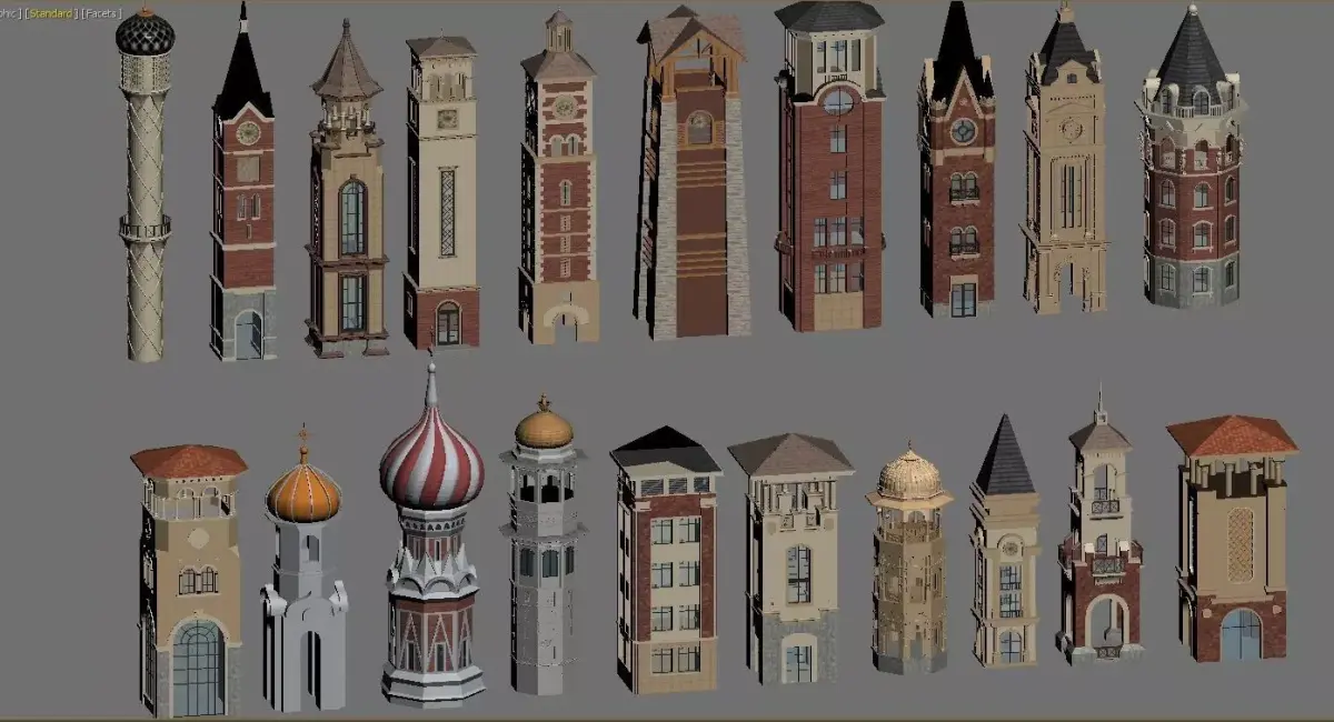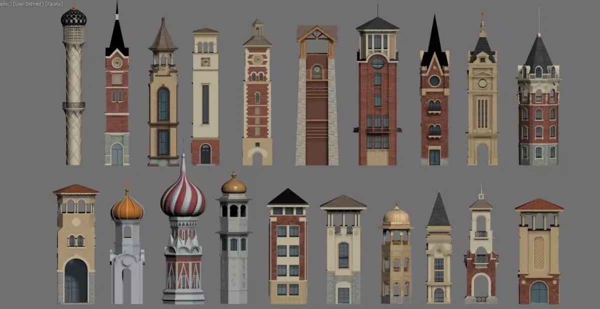 This is a diverse collection of tower and clock tower architectural models, featuring 20 individually designed structures that exude a strong European and exotic flair.Diverse Styles: The collection includes classic European structures such as red-brick clock towers and stone towers, alongside architectural styles with Russian and Islamic influences, like onion domes and rounded domes.Rich Details: The models feature meticulous craftsmanship in their materials (red brick, stone, wood), roof designs (spires, domes, gabled roofs), and decorative elements (clock faces, arched windows, intricate carvings), showcasing architectural aesthetics from different historical periods and regions.Applications: These models are versatile and can be used for diorama construction, game art assets, architectural design references, and collectible displays, serving as both visually appealing and practical vessels of architectural art.