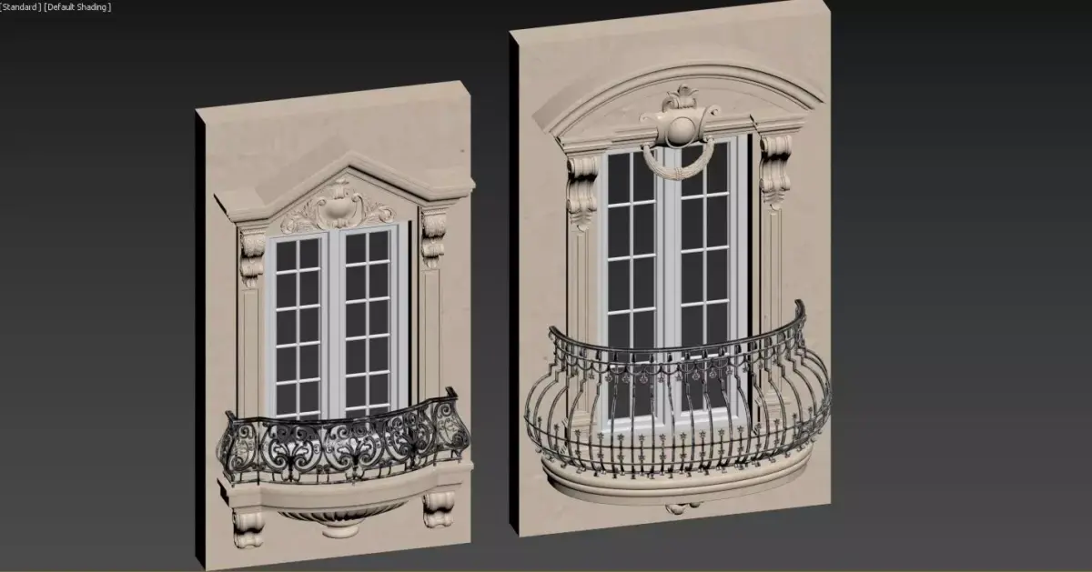 This image showcases two designs of European classical-style bay windows, both featuring the classic combination of off-white stone window surrounds and black wrought-iron railings:Left Window Design:Topped with a triangular pediment, it is adorned with intricate scroll relief carvings, flanked by delicate volute corbels on both sides. The wrought-iron railing is dominated by smooth curved scroll patterns, presenting an overall sense of Baroque opulence and symmetry.Right Window Design:Featuring a curved arch top, the center is decorated with a shield-shaped relief and drapery-style carvings, with softer lines overall. The wrought-iron railing is accented with vertical lines and small floral ornaments, embodying a style that leans more toward French romance and elegance.Both designs leverage the rich texture of stone and the sleek curves of wrought iron to create the delicacy and solemnity of classical architecture. As typical decorative elements for the facades of high-end villas and European-style residences, they perfectly combine aesthetic value with practical functionality.