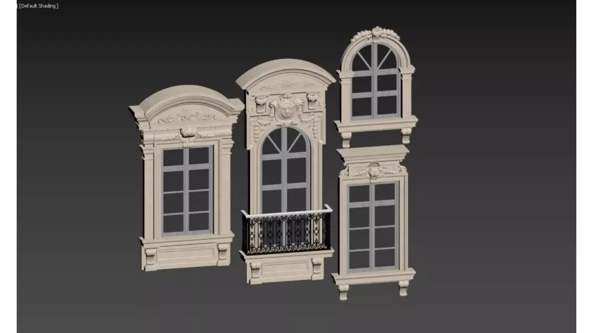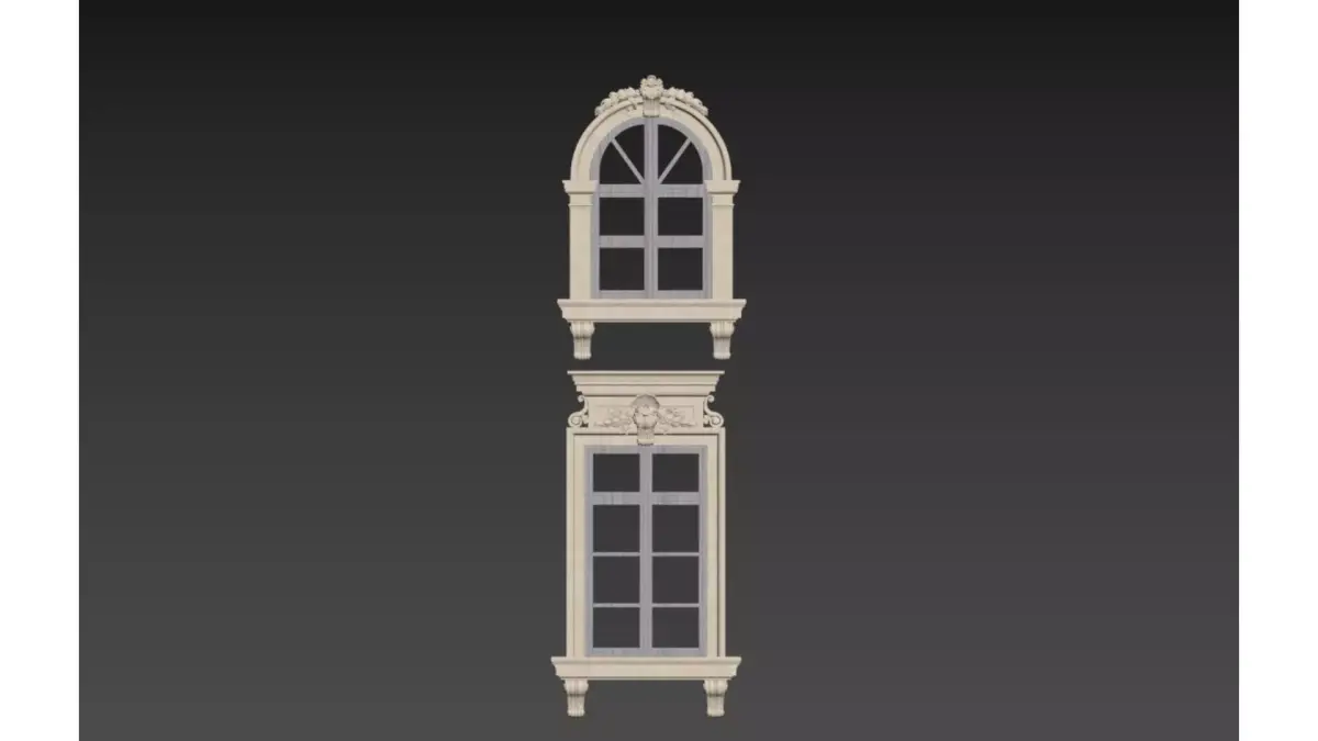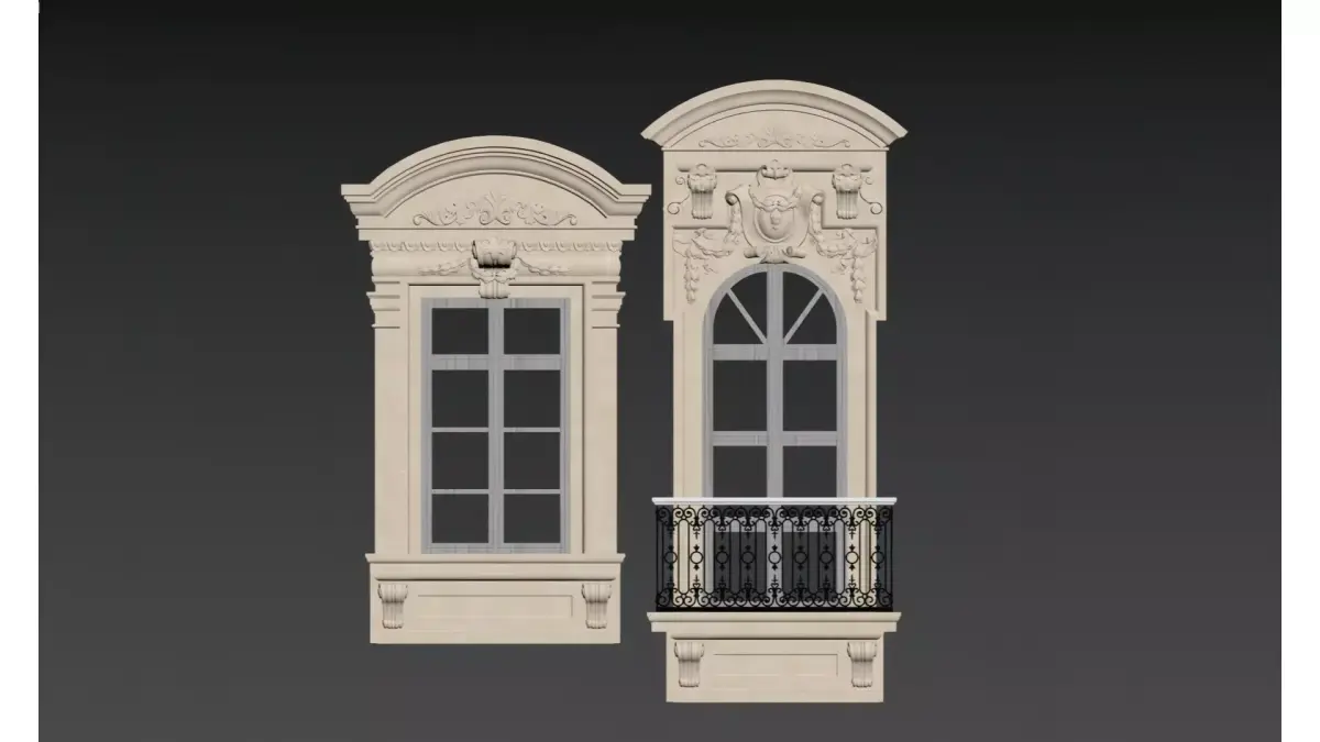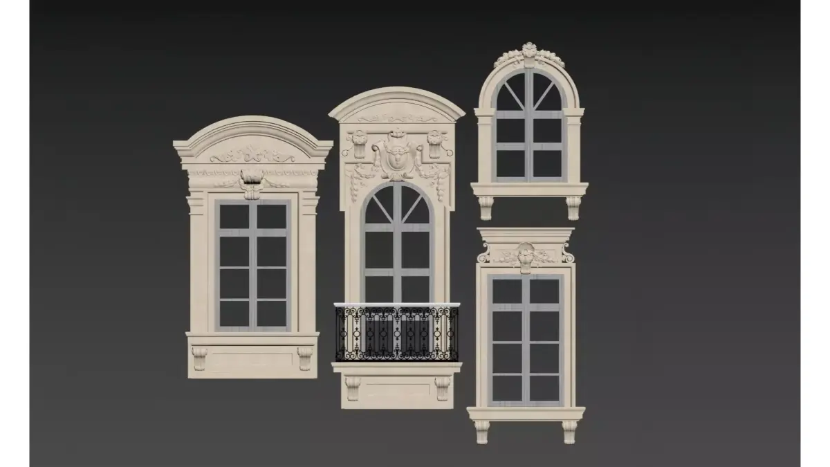 This set of images showcases four designs of European classical-style window surrounds, crafted from off-white stone or GRC (Glass Fiber Reinforced Concrete). Adorned with elaborate relief carvings and decorative engravings, they present an elegant and solemn visual effect overall.Design FeaturesThe tops are mostly curved or arched structures, paired with Baroque decorative elements such as scroll patterns, volutes, and human face reliefs. The lines are smooth and layered, exuding a strong classical charm.Application ScenariosSuitable for the facades of high-end villas, European-style manors, hotels, and other buildings, these window surrounds can significantly enhance the sense of luxury and historical weight of the architecture.Craft DetailsSome window surrounds are equipped with exquisite iron railings or stone corbels at the bottom. These components not only enhance structural stability but also enrich the layering of the building facade, making them a model of the combination of classical architectural aesthetics and modern craftsmanship.