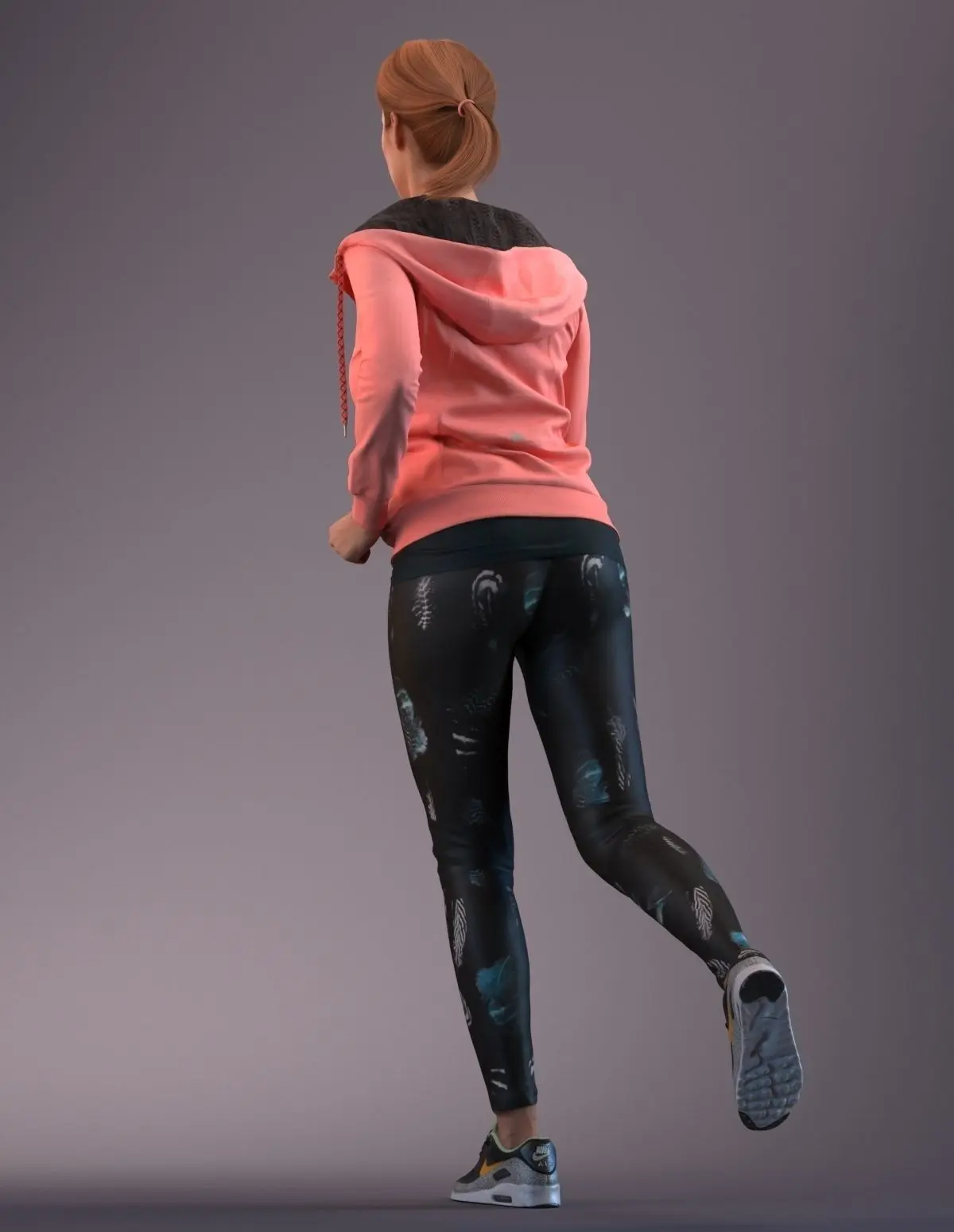 Pre posed 3D model of a European woman jogging in sportive clothing