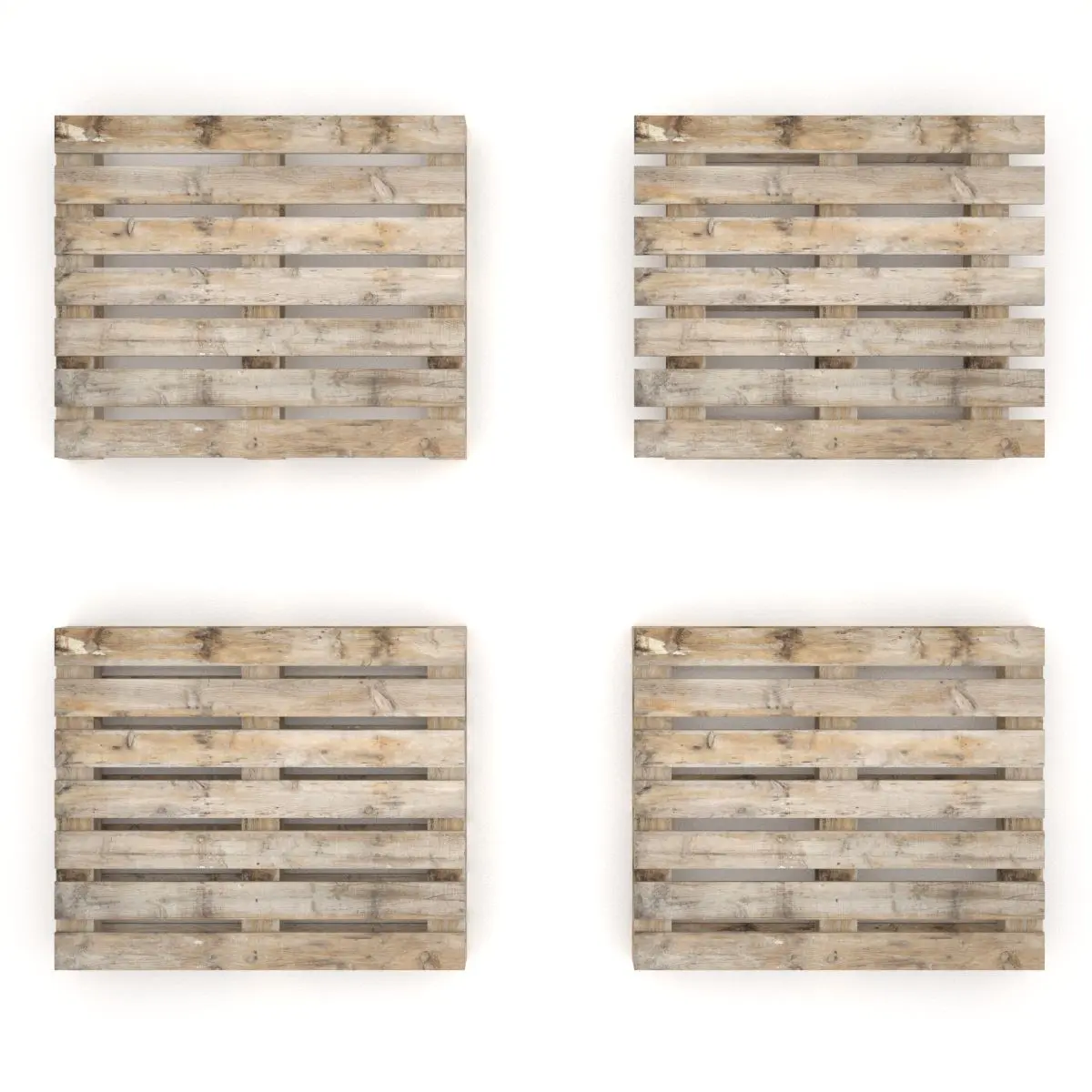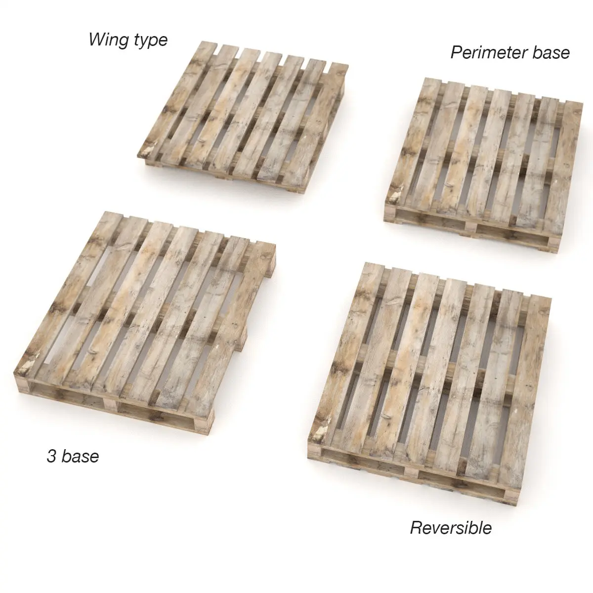 Models: Reversible pallet : 230 polygonsWing type pallet : 178 polygons3 base pallet : 160 polygonsPerimeter base pallet : 178 polygons