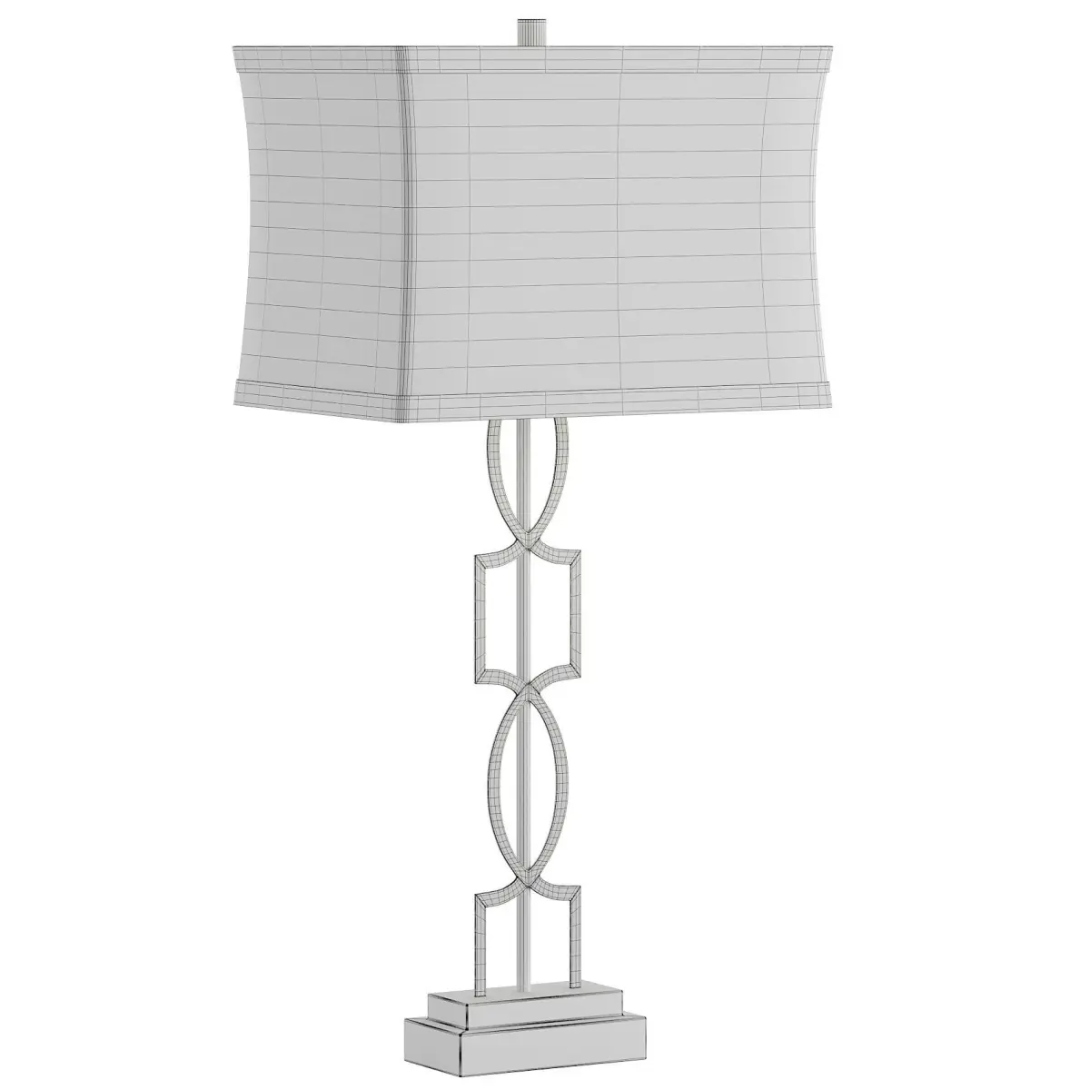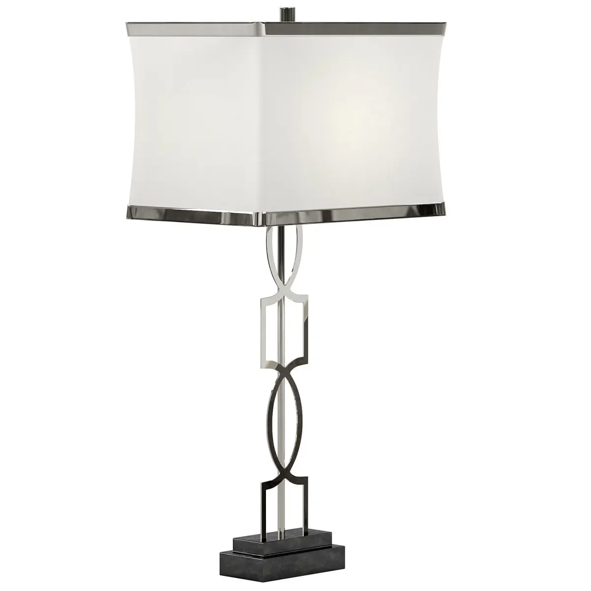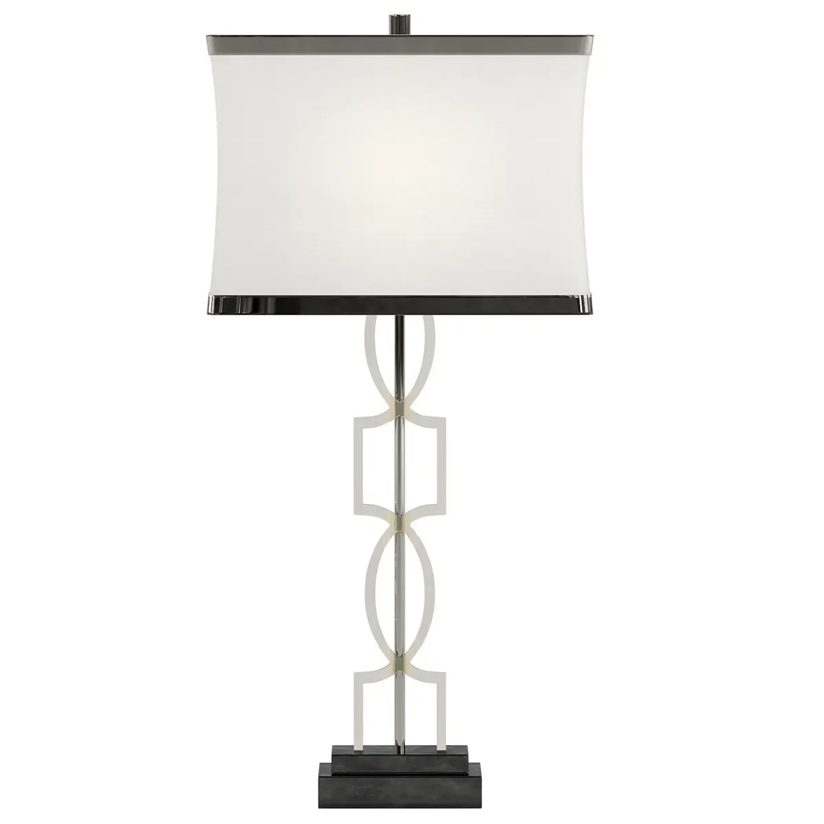 With abstract-shaped bases in a brushed nickel finish and curved rectangular shades, these modern table lamps make bold statement pieces. Each design sits on top of a black marble pedestal. Each lamp has an integrated USB port for easy charging of your devices. The USB ports work with the light turned off and are meant for use with smartphones.