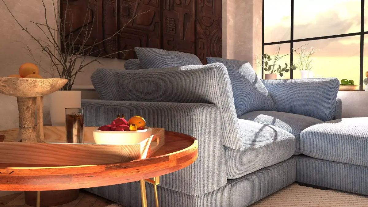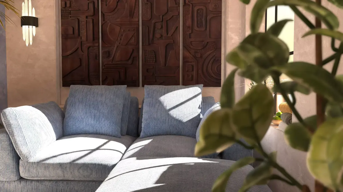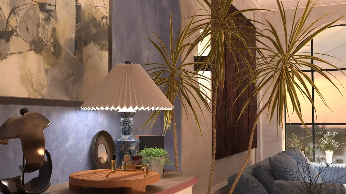 corner interior with big blue velour sofa and decorations in the evening. The scene uses Vray Sun and hdri map, also with vray light in room lighting lamps. each object is signed and formed into a group.in the archive folder called interior there are all files including textures and renderspolys: 3 671 482verts: 3 581 606