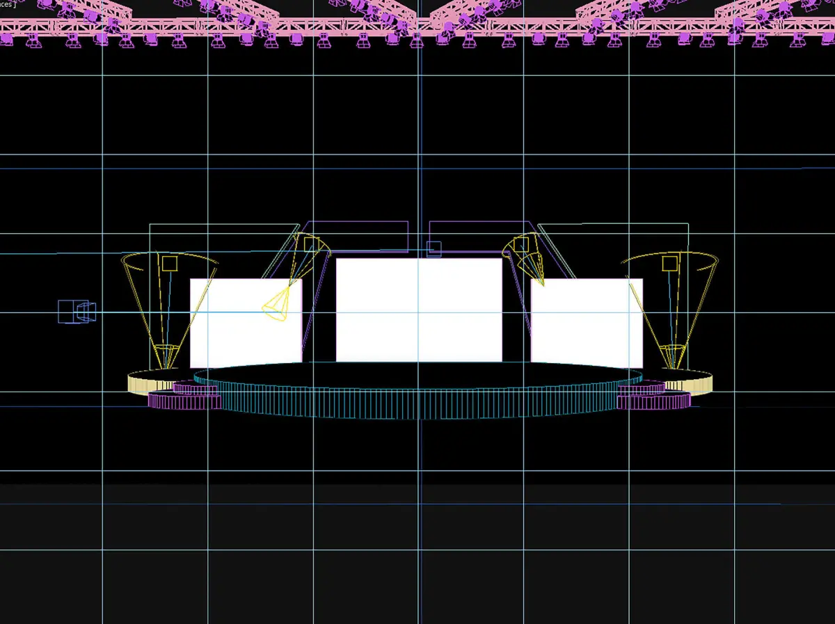 A 3D event stage or conference with 3 main Led screens for video projections can be used on varied projects for a corporate special event or concert. The stage has a unique design for the structure of the wall that contains Led screens, stairs on the sides, and projectors with a metalic structure on the roof for lighting the scene.