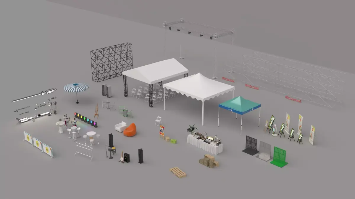 Complete event equipment collection 3D model designed for festivals, outdoor events, exhibitions, brand activations, and corporate functions.This pack includes a wide range of modular event assets, allowing users to quickly build realistic event layouts and professional presentations.The collection features event tents, truss structures, lighting systems, speakers, stage barriers, furniture, food booths, signage, and decorative props, suitable for both small and large-scale event visualizations.