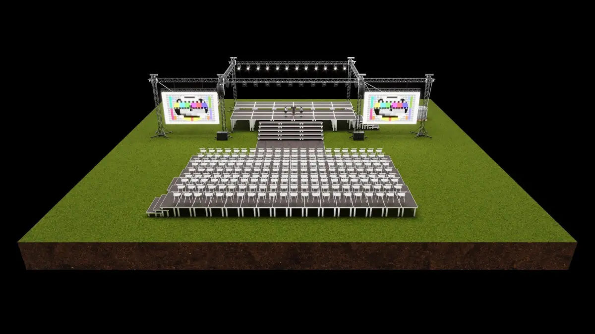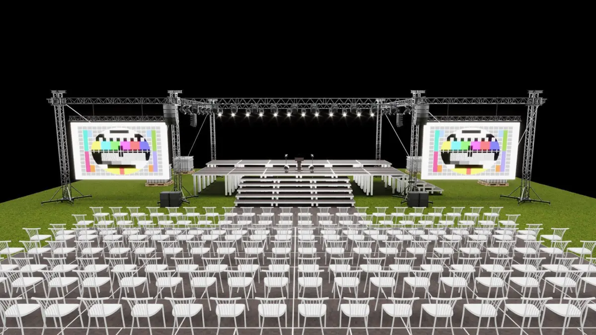 The file includes 6 leg truss, podium, rostrum , and chair model. You can easily make corrections for your activity within the file. You can change the number and location of objects in the file according to your activity. This model does not include any sound or lighting systems. If you need such assets, feel free to browse my profile to explore and purchase them separatelyI also offer you outputs in different formats.
