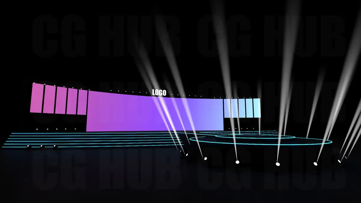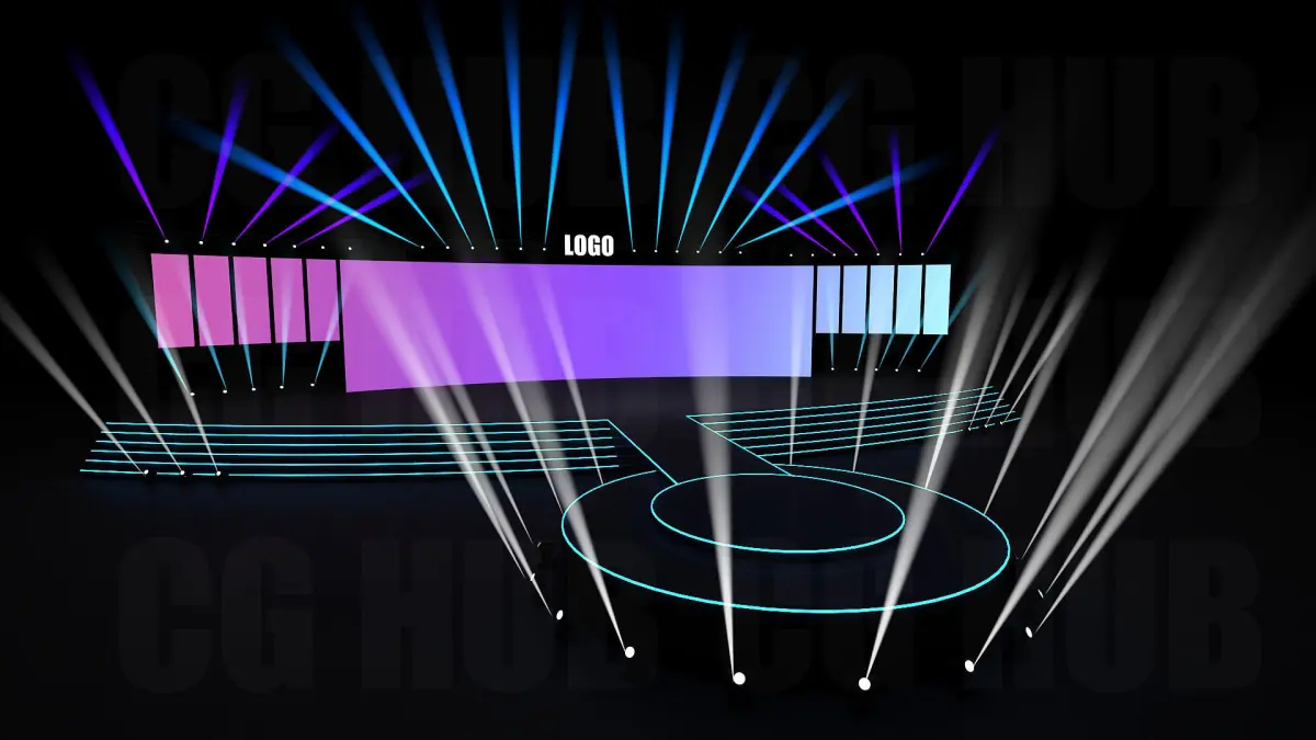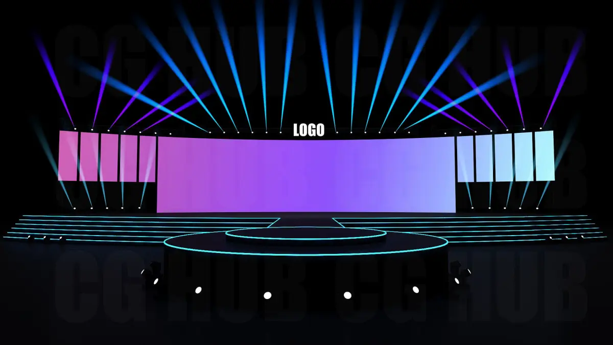 3D Stage deign Stage Size- Platform-100ft width, Center Screen-20mx5m Scene is ready to render as seen on the previews. Light setup and all materials are included. Renderer:V-Ray 5.0 Format: