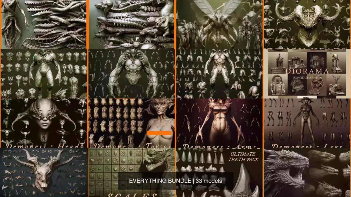 In this you will find the following high-poly untextured creature & character parts for kitbashing/concepting/bases for further sculpting/miniature-creation etc: