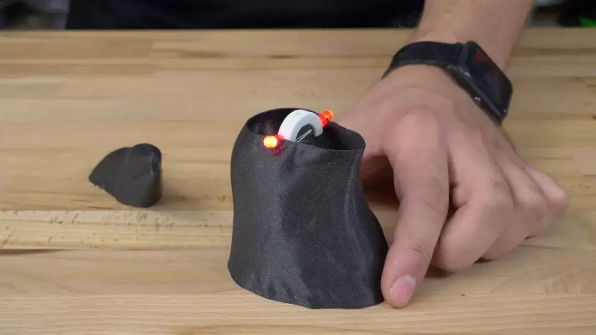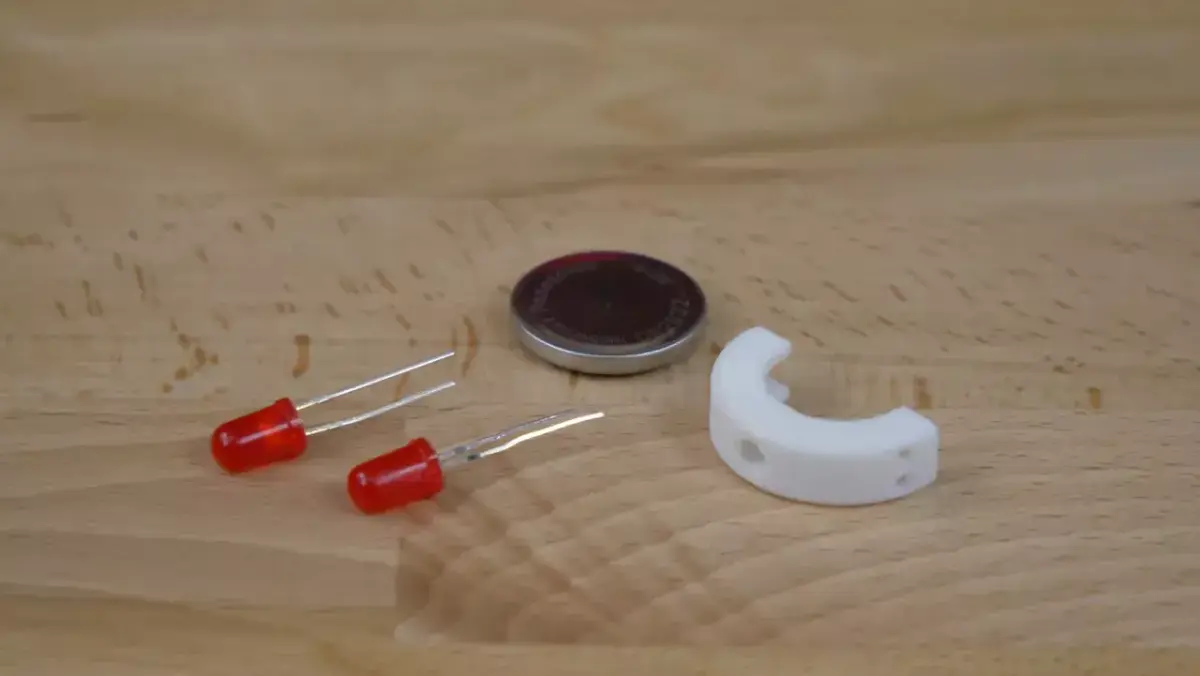 Hardware: 2x 5mm red LEDs, 1x CR2032 battery, included snap-fit holder (no solder); hardware not included with STL