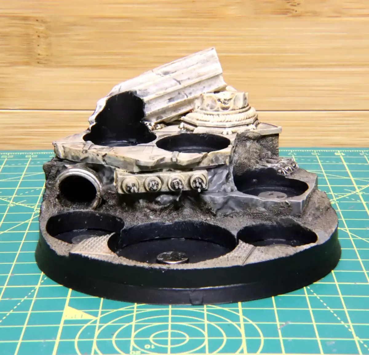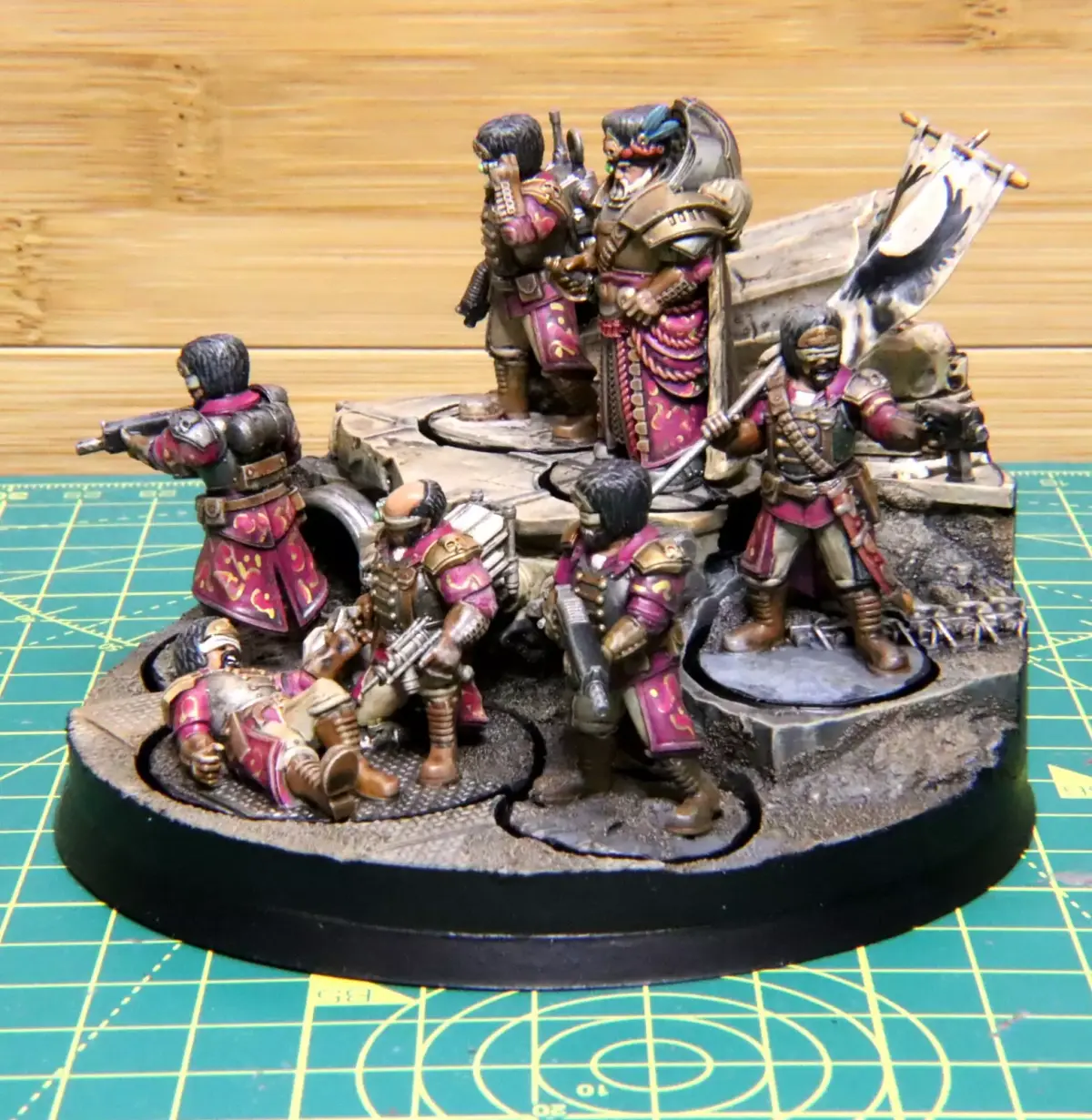 This is a modular display piece and Primus Scions command squad.The squad comes with two guards, a medic, standard bearer, communications officr and general. All models are modular and split into arms, legs, torso, and head and are cross compatible with our other human scale kits.The display base fits on a 100mm standard base, with slots for five 25mm bases and a 40mm base.