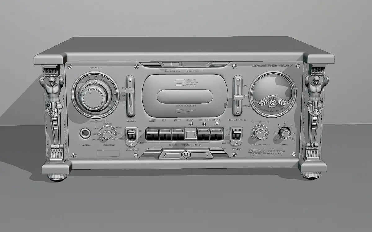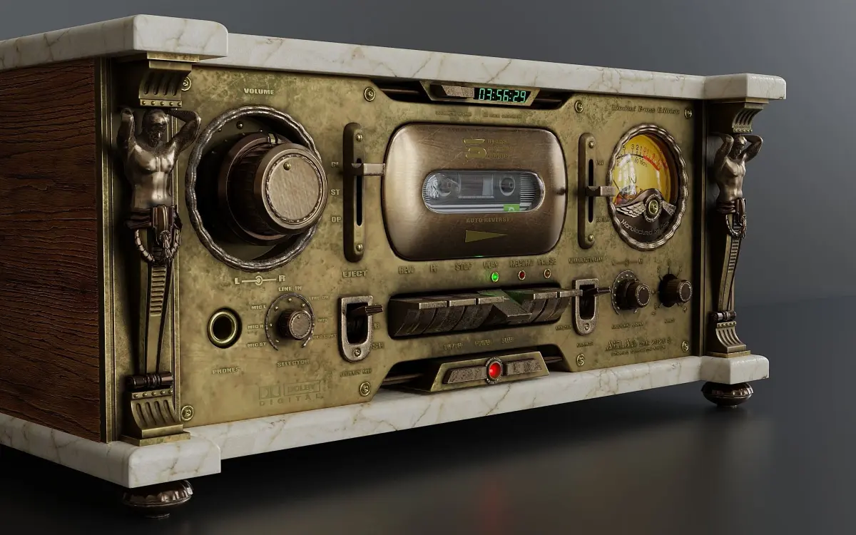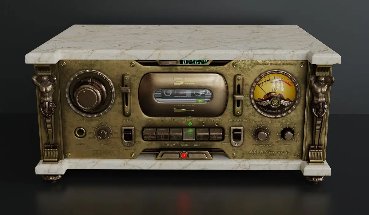 Aged metal cassette deck. All details of the model are combined into one object. Light bulbs (indication) are tied to the main object. All textures (substance painter. resolution 2048x2048) are packed in a zip archive. The archive contains additional textures (vu meter, electronic counter, wood, Dolby icon, cassette). Lettering Material (letters)is principled BSDF(blender)
