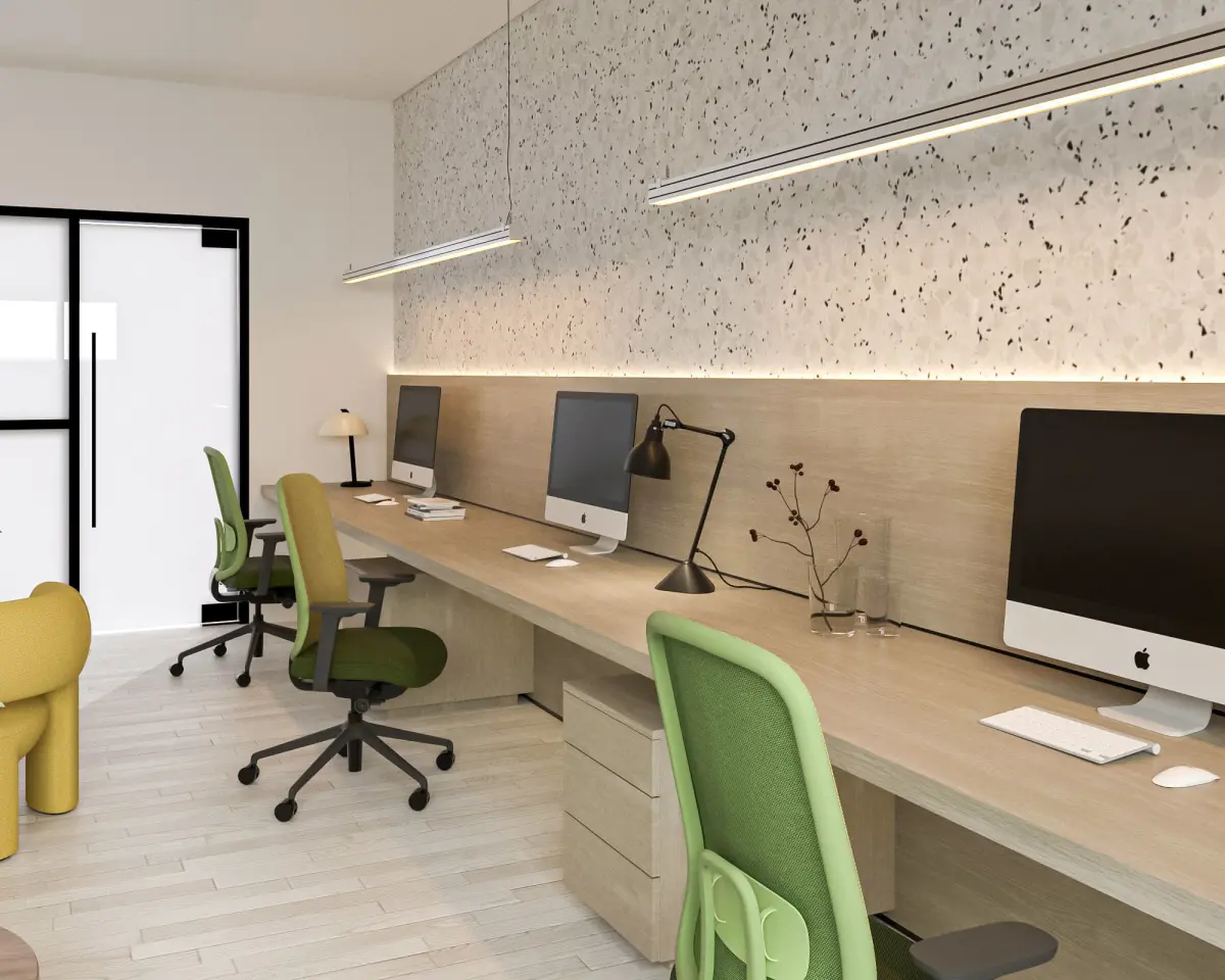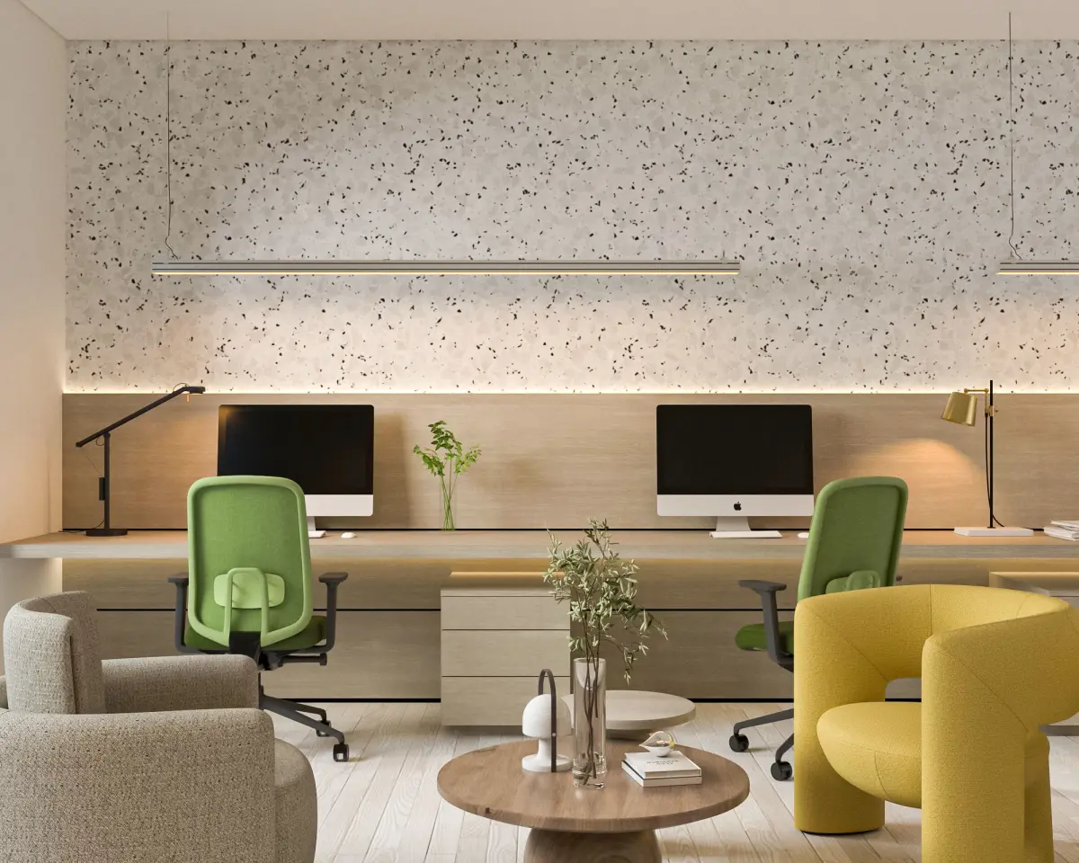 This workstation has a simple and efficient design, resulting in a modern and professional ambiance. The major visual feature is the terrazzo textured accent wall, which is complemented by a long wooden work table that integrates with the storage cabinet below. The use of green chairs gives a new touch to the area while also creating an interesting contrast to the neutral colour scheme of the hardwood floor and walls.