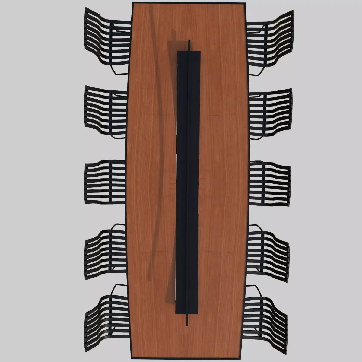 This set includes a long rectangular table with a polished wooden surface and stylish black metal base.The chairs use a unique curved-slat design, giving a premium contemporary look suitable for high-end office setups and professional meeting areas.