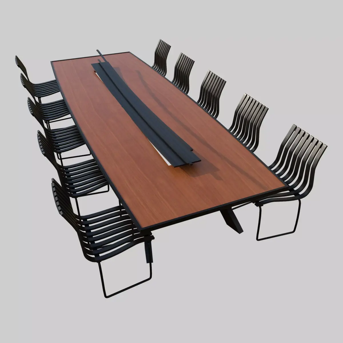 A high-quality Modern Conference Table Set featuring a sleek wooden meeting table paired with elegant metal-frame chairs.Designed for office interiors, conference rooms, co-working spaces, commercial environments, and architectural visualizations.