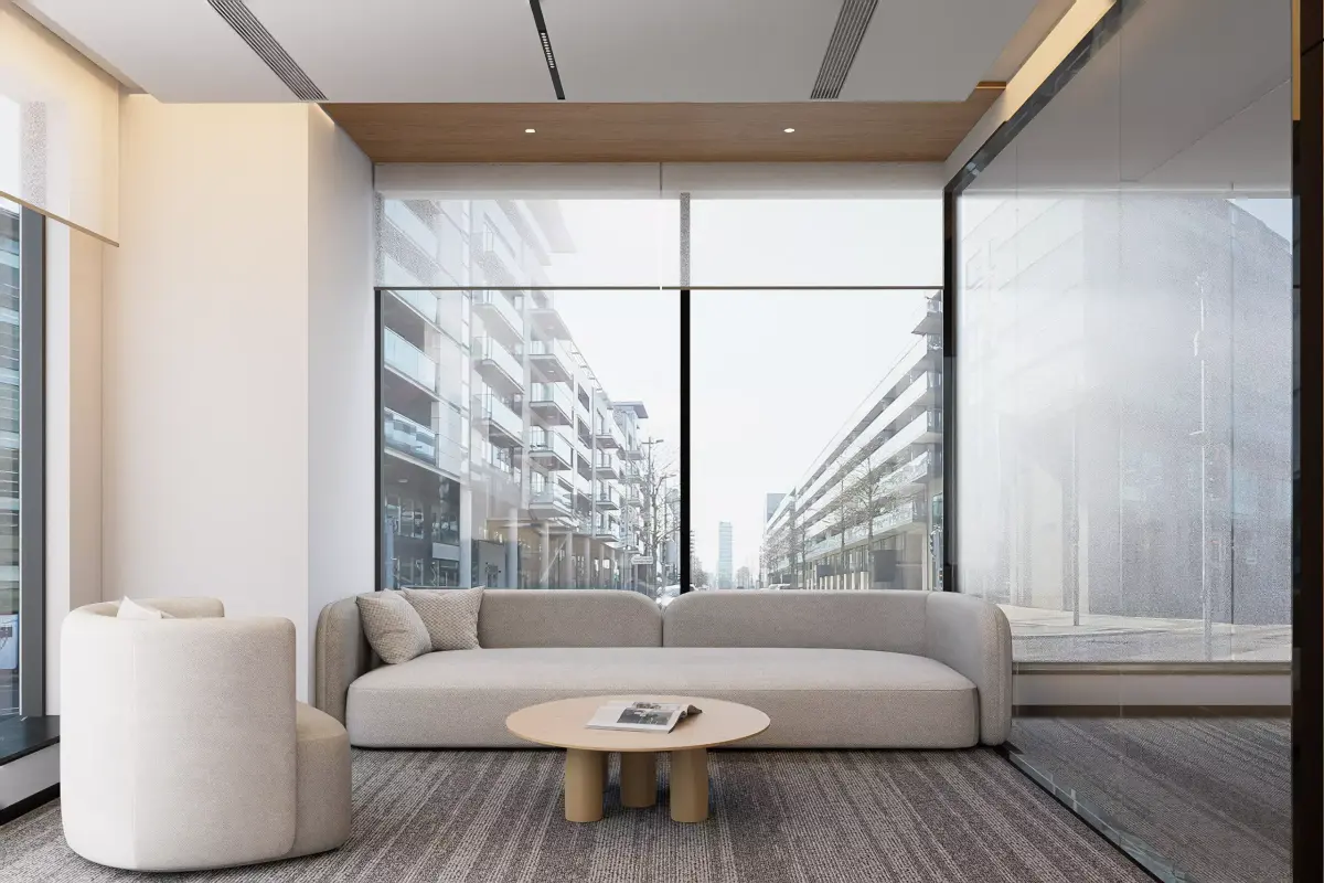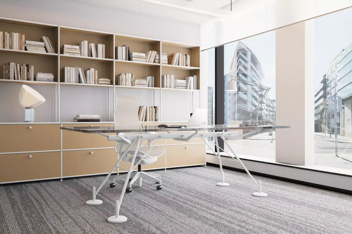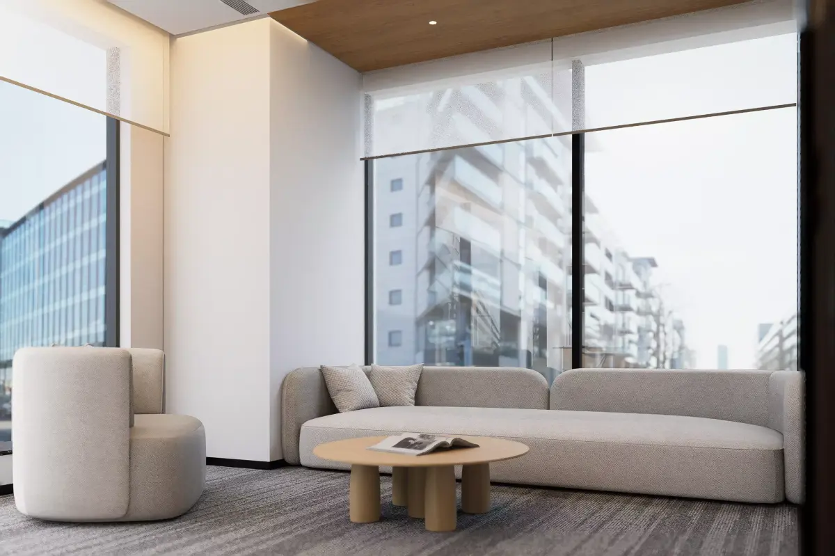 - Scene Composition: Ergonomic furniture layout optimized for productivity and client interaction
