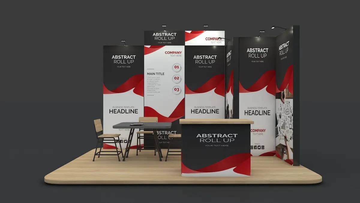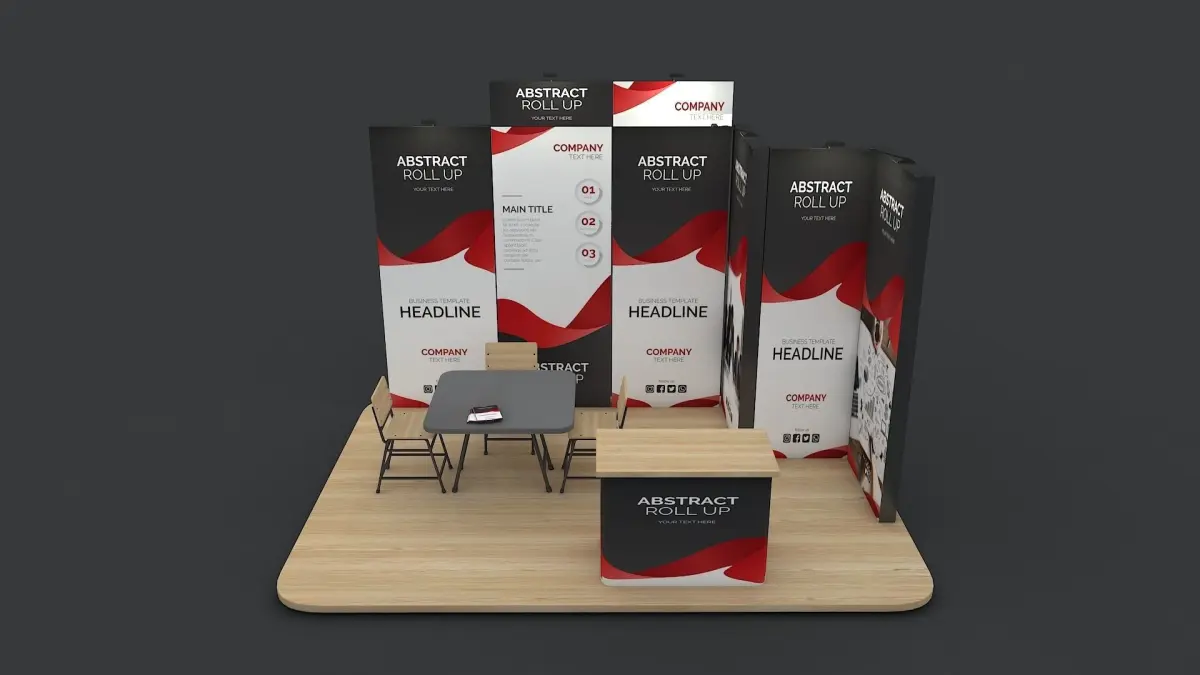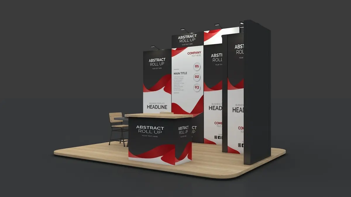 Exhibition Booth design 3d model with textures and Vray Next lighting and rendering settings.