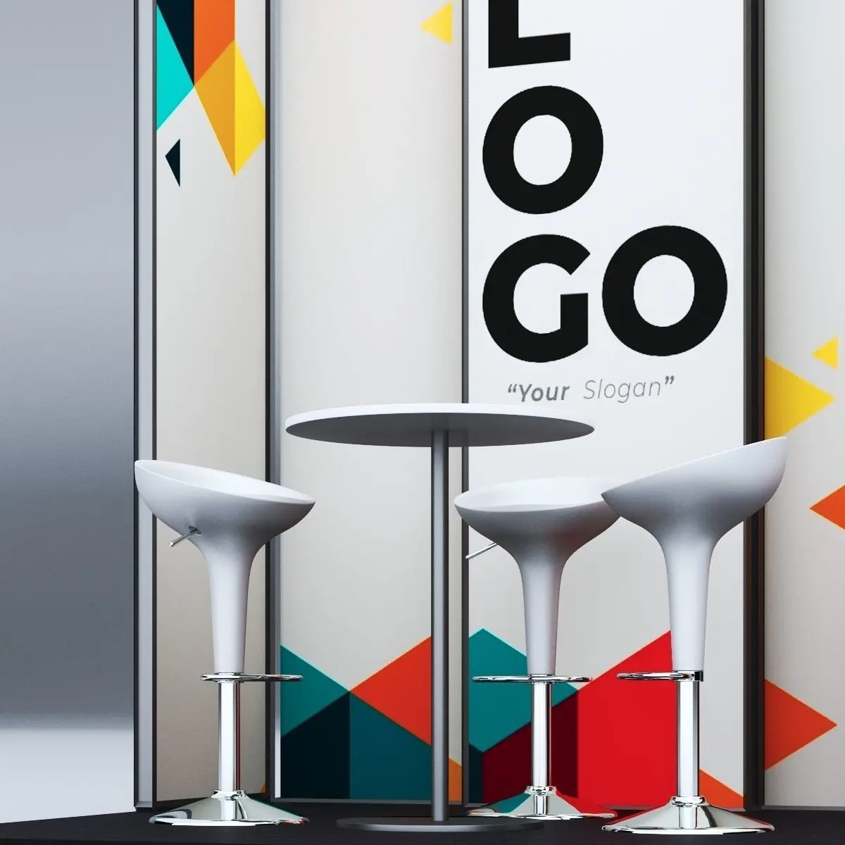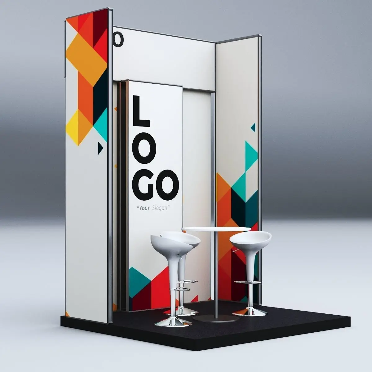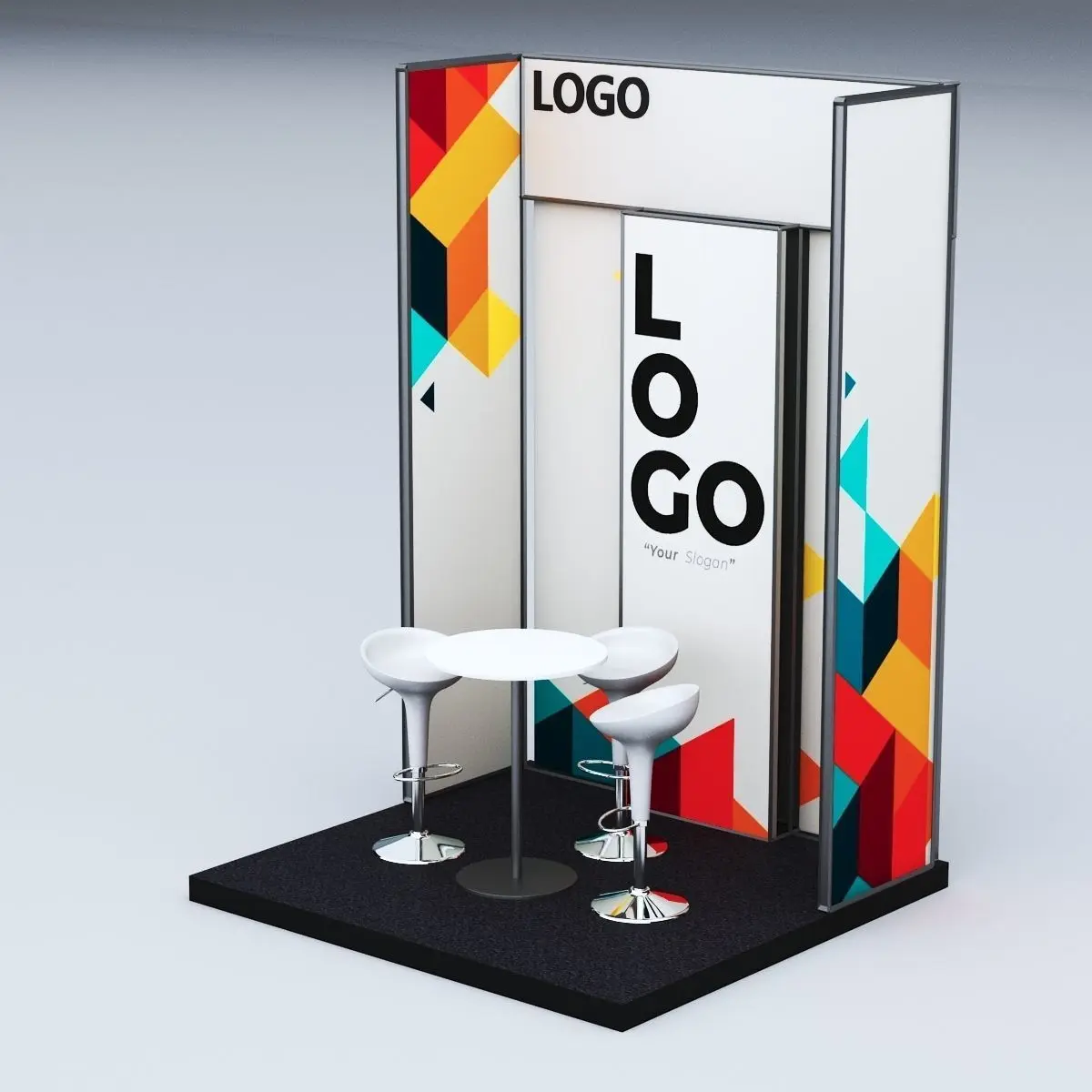 3d model of an exhibition booth, consisting of a back panel and side panel enclosed with metal bars with a unique design for the back panel and a place for your logo and slogan. The model also includes a unique high stool chairs with a table. The whole booth design is elegant and a modern design and can be place in any exhibition. The whole structure is an original design done from the preliminary sketches to the final renderings by us.