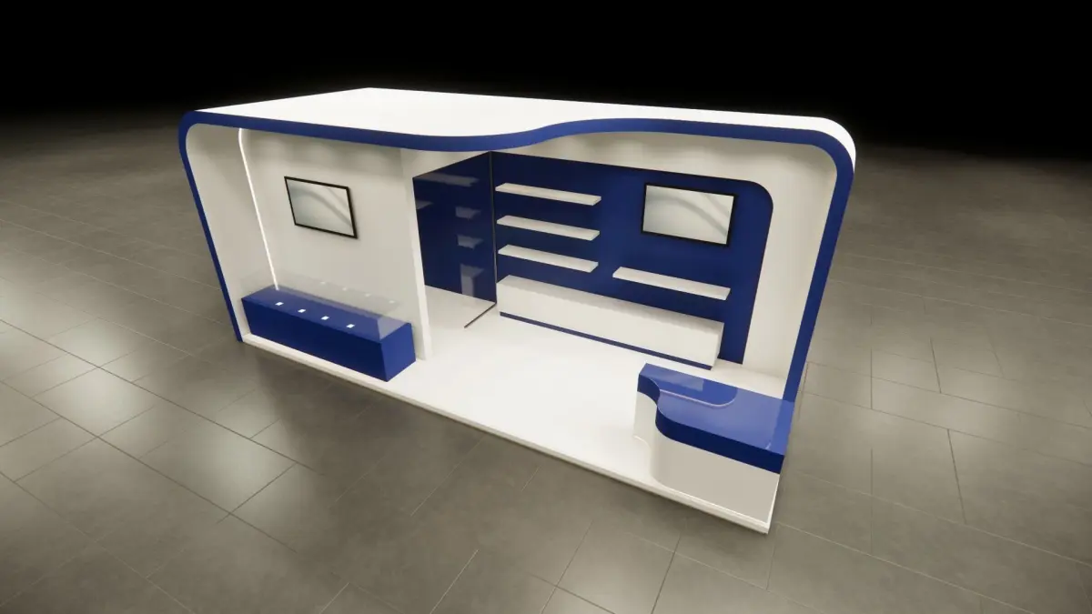 Exhibition booth 3d model ready to render and modeled in real scale dimensions . Ready model for render just place your final edits & branding , several extensions are provided (dae, fbx and 3ds)