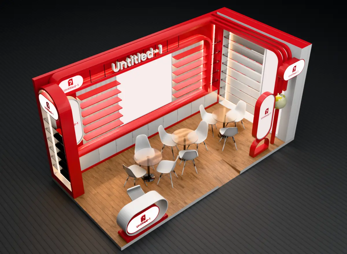 Sleek and functional exhibition booth with a 3x6m layout and 3m height, designed to showcase products and engage visitors. Features include illuminated shelving, branded signage, seating arrangements for meetings, and an inviting red and white color scheme. Native Blender file available for customization.