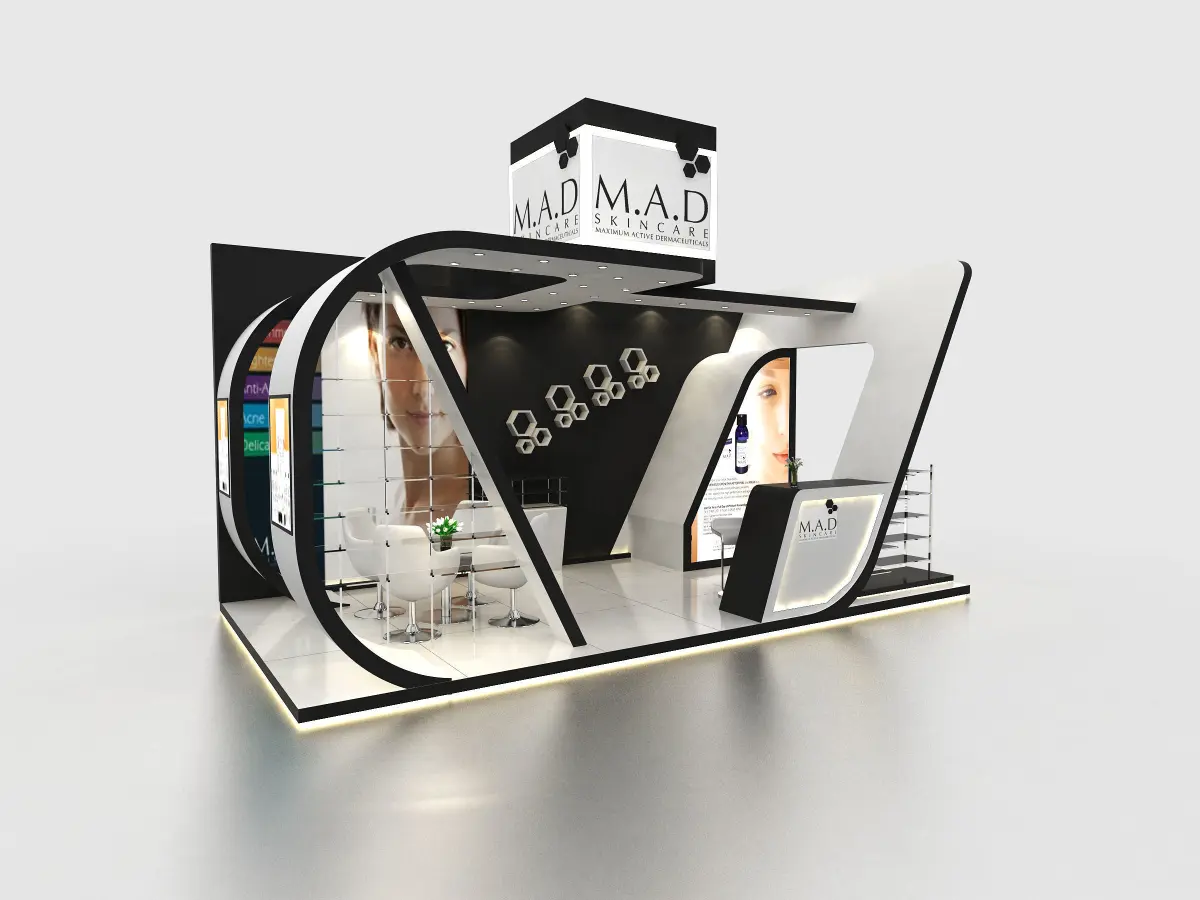 This is my 2nd exhibition booth design. you can ajdust sizes and use for your required design. I created this with 3ds max 2014 and all the rendering settings are included. adjut your size and render. You will have to do the branding and make it more beautiful.