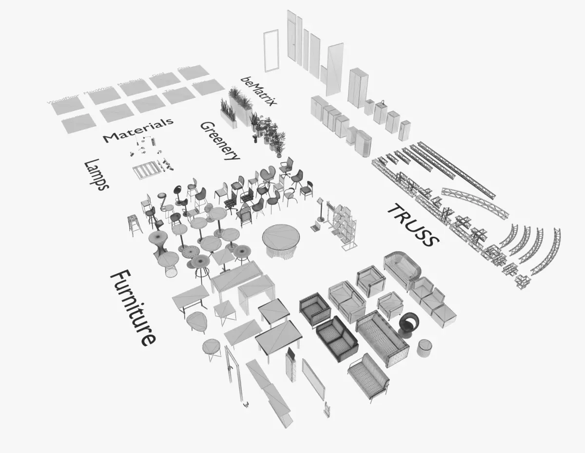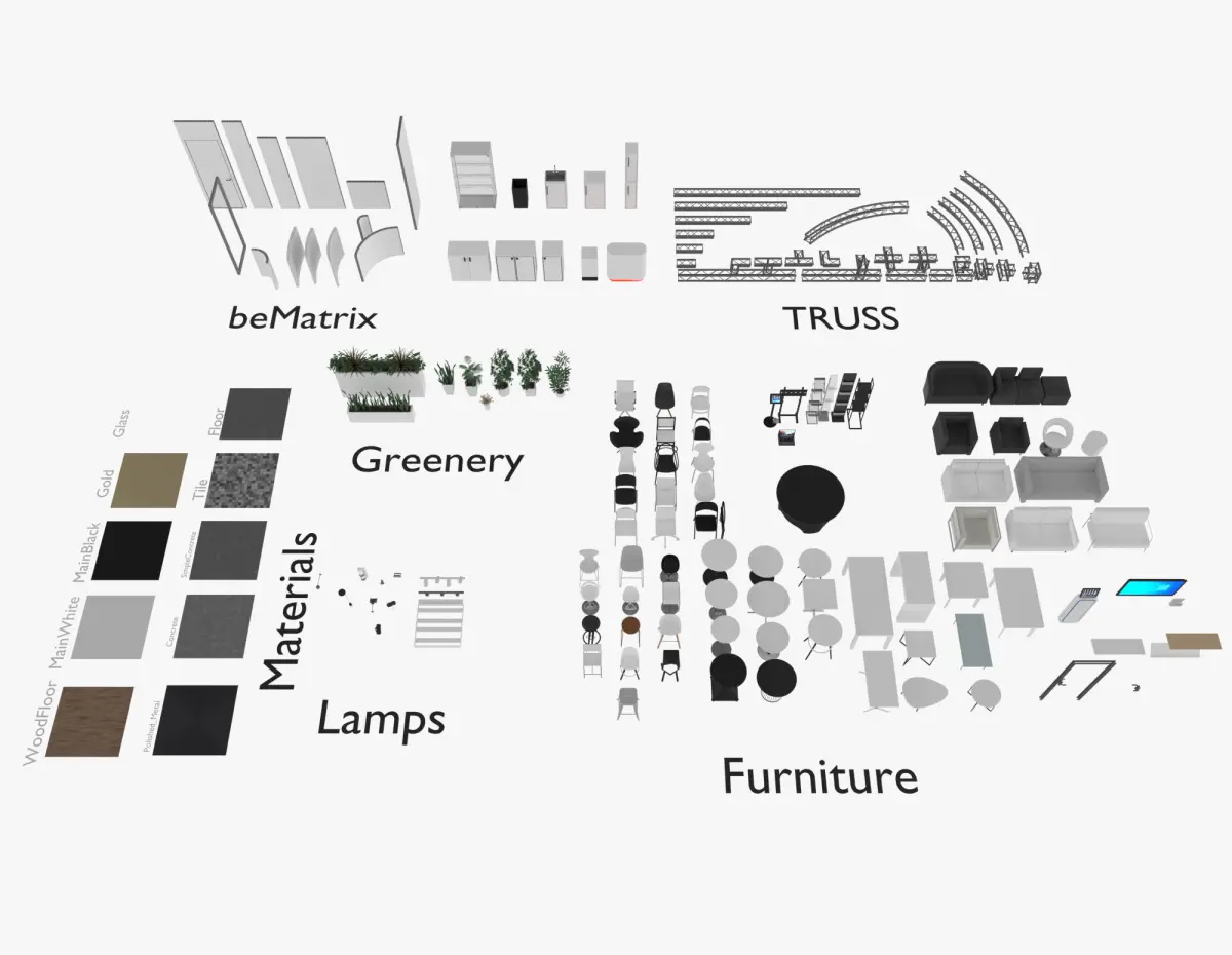 - Lamps, different furniture, greenary, Truss system, beMatrix system.