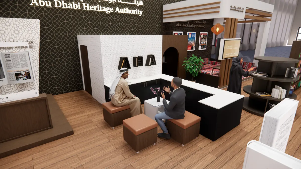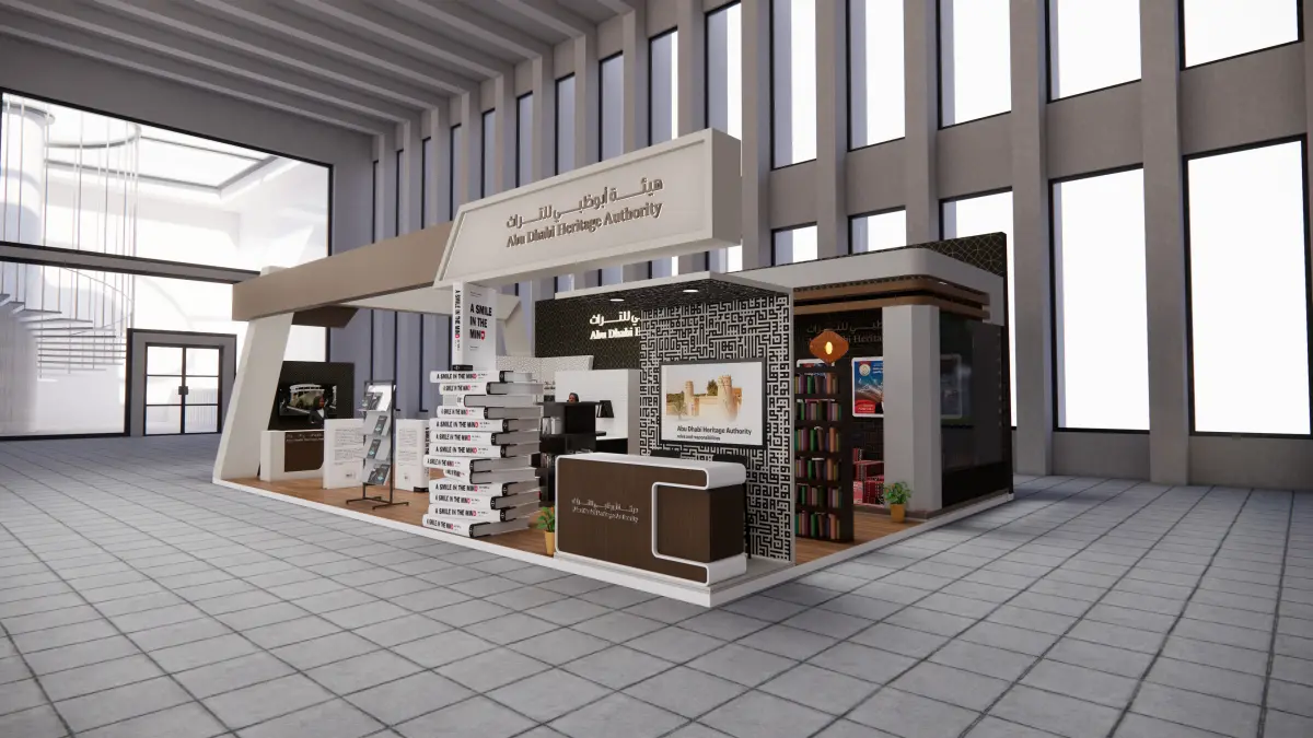 Modern exhibition booth designed for the Abu Dhabi Heritage Authority. This stand combines cultural elegance with a contemporary layout, ideal for showcasing publications, multimedia content, and interactive exhibits. Features include modular bookshelves, reception counter, media displays, and traditional-inspired design elements. Suitable for book fairs, cultural expos, and public events. in UAE, united arab imarates.