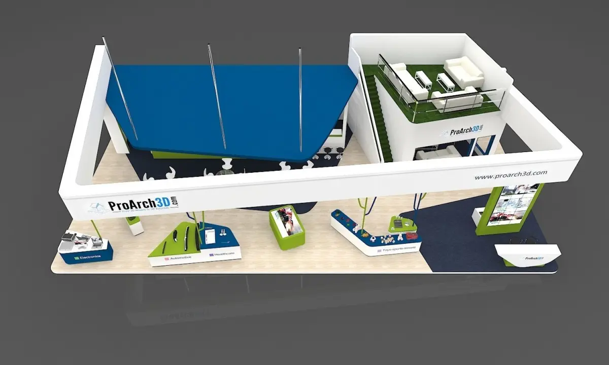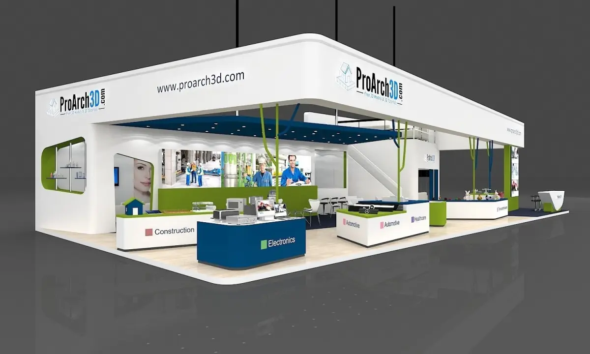Exhibition stall 20 mtr x 10 mtr 3 sides open. Ready to render and modeled with real world scale. You just need to change the materials such as color theme, logo and graphics panels as per your requirement. No render setup required. Provided with lighting and render setting. Modeled in 3ds max and rendered in Vray. OBJ, FBX, 3DS files also included with textures along with 3ds max 2020 file.