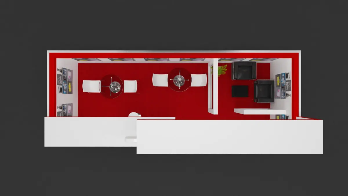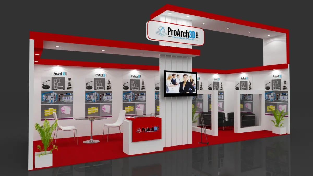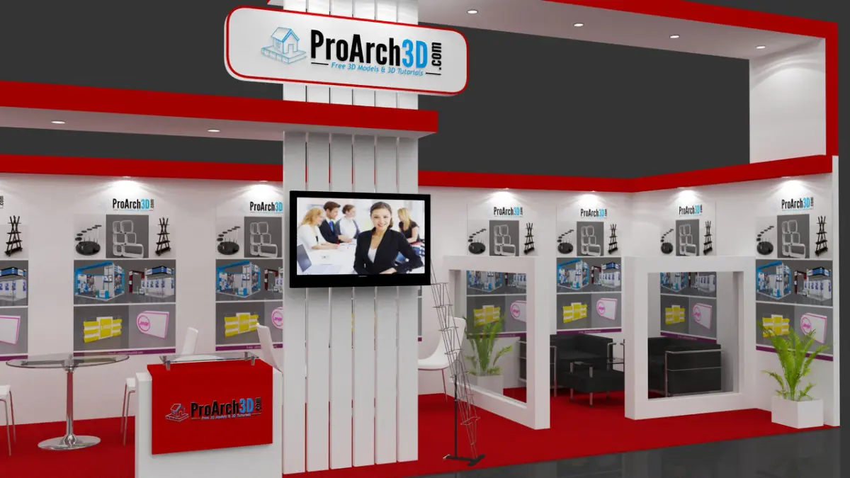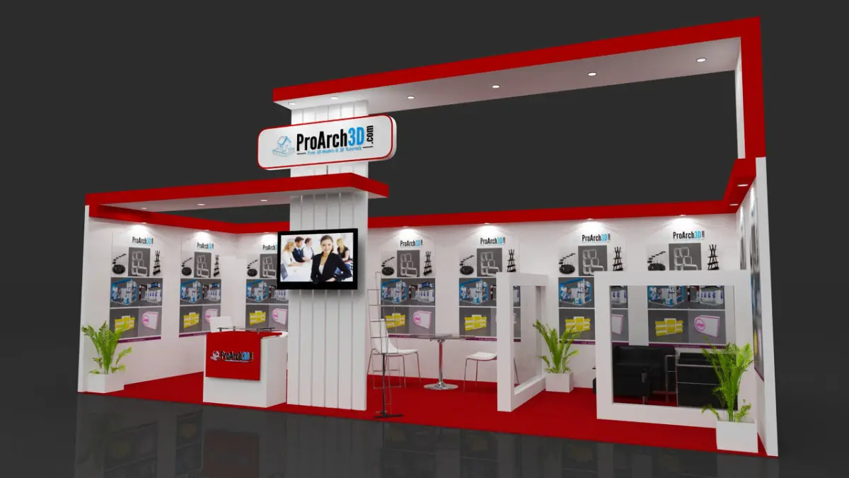 Exhibition stall 3d model. Ready to render and modeled with real world scale. You just need to change the materials such as color theme, logo and graphics panels as per your requirement. No render setup required. Provided with lighting and render setting.
