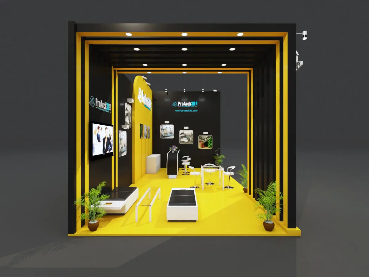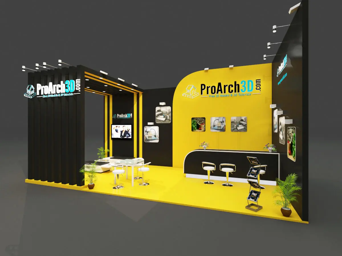 Exhibition stall 8 mtr x 4 mtr 2 sides open. Ready to render and modeled with real world scale. You just need to change the materials such as color theme, logo and graphics panels as per your requirement. No render setup required. Provided with lighting and render setting. Modeled in 3ds max and rendered in Vray 3.6