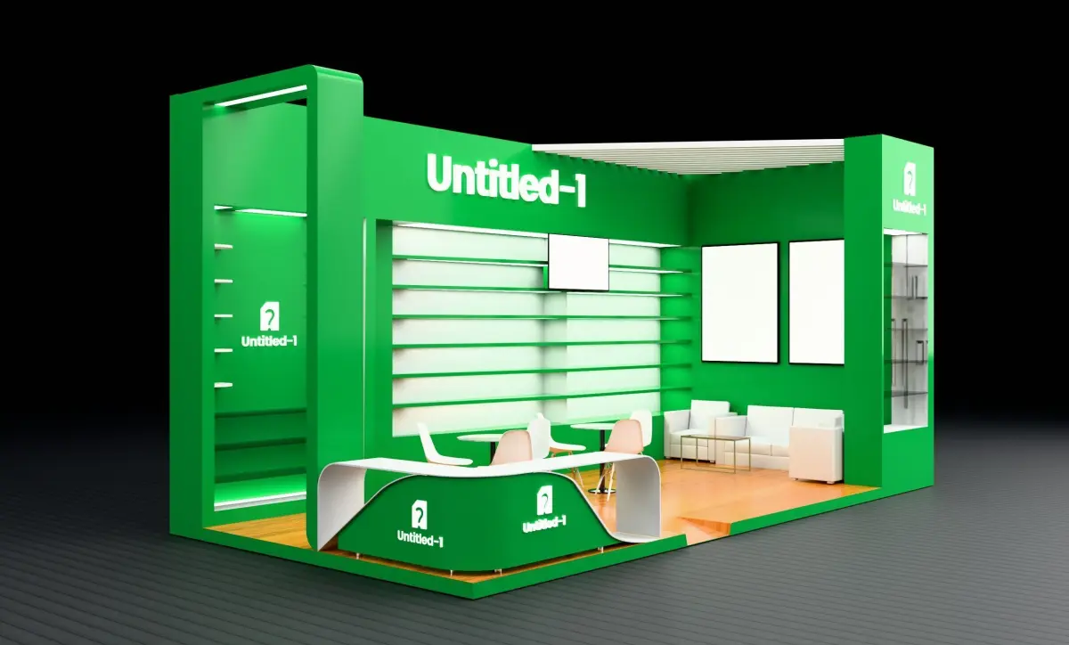 This 3x6 meter green exhibition stall design with a 3-meter height exudes sophistication and eco-friendly vibes. It features a clean, vibrant green theme, paired with wooden flooring for a natural touch. The stall includes a reception desk, display shelves, lounge seating, and a functional meeting area with modern chairs and tables. Designed in Blender, this layout prioritizes space efficiency and visitor comfort, making it an ideal choice for showcasing products or services at trade shows.