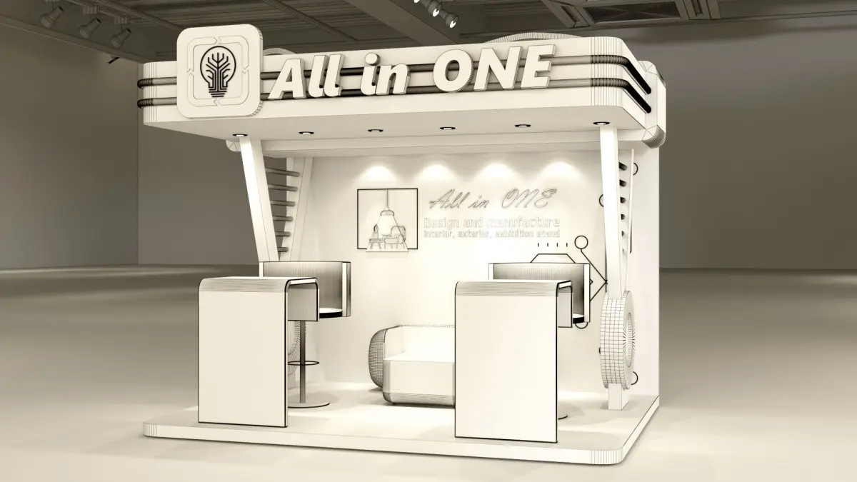 3D model of the exhibition stand. Simple and manufacturer-friendly prefabricated construction. Suitable for presenting a company or product at exhibition events