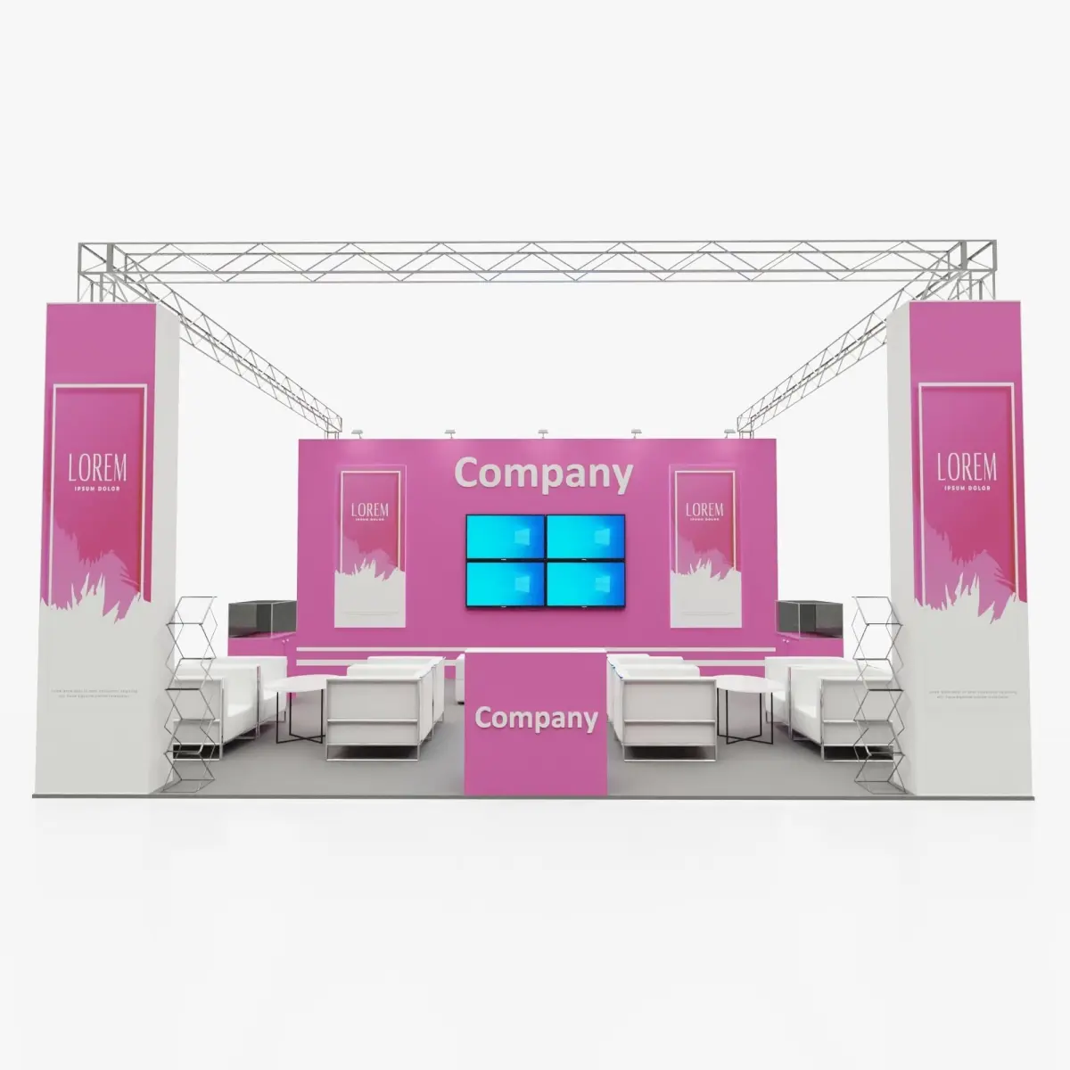 Exhibition expo stand 3D model 7m x 8m sizeAll the furnitures and objects in the renders are included in the model.All the render cameras and options are set in the scene so they are ready to renderAll the lights are set and ready.