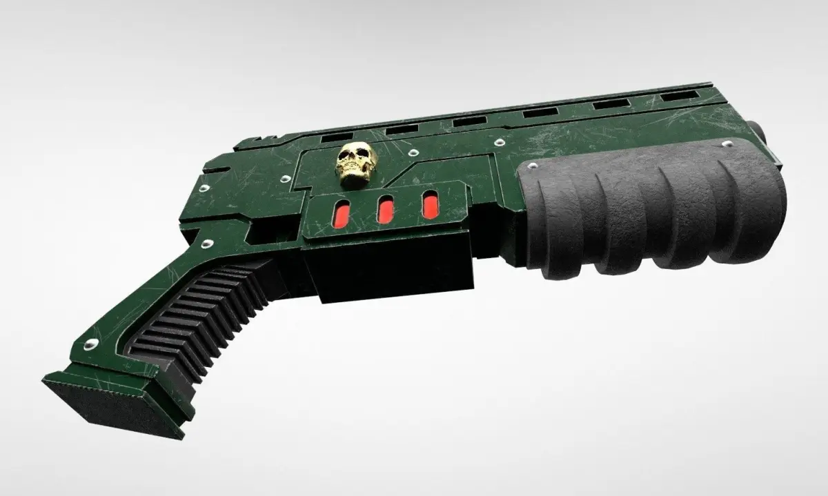 High poly Exitus pistol from the warhammer 40k fictional universe, modeled in blender and textured in substance painter, highly detailed and optimized to be used in animations games and cenimatics