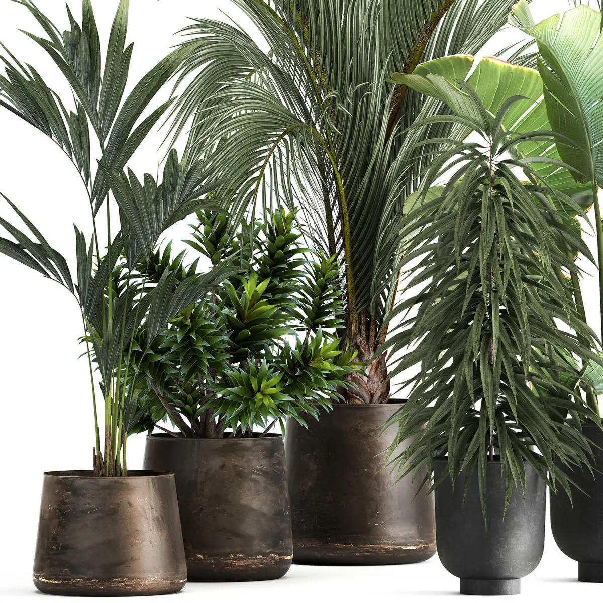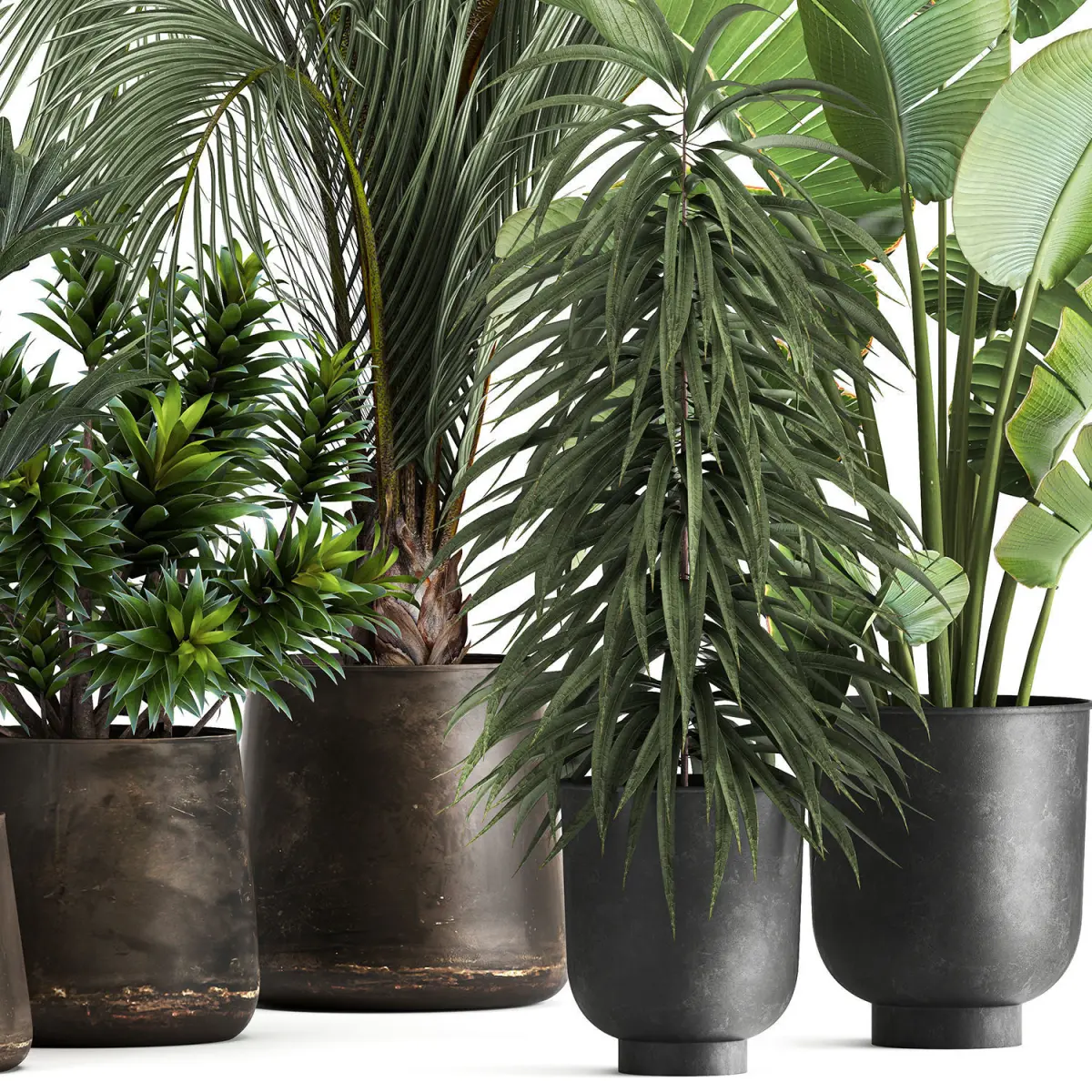 Decorative plants for the street and interior in metal flowerpots.Pot - Vig Planter L Set 2pcs, GrayPot - RECLAIMED ARTIZAN IRON COPPA POTHouseplantsexotic plantstropical plantsHedyscepe canterburyana – palm treeHowea forsterianaAreca palm tree, decorative, interior, indoor, pot, flowerpot, flower, decorFicus AliiFicus binnendijkiibanana palmRavenala madagascariensisStrelitziaDracaena reflexa