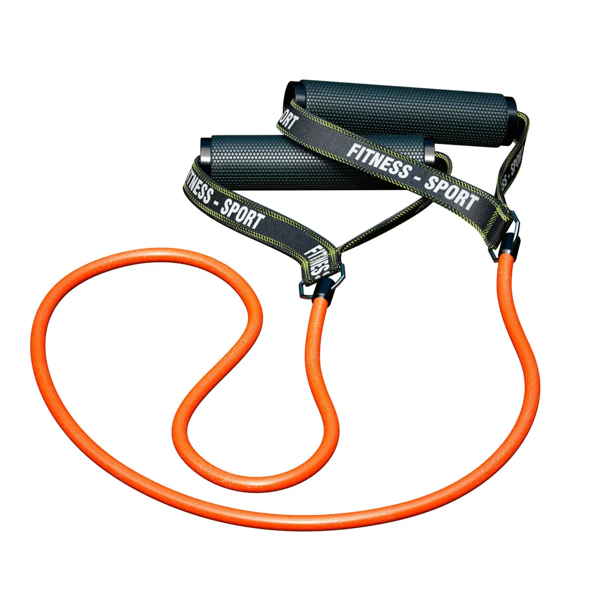 3d model of a rubber expander for fitness. Rubber harness with attached rubberized handles on fabric logo straps. Colors - orange, white, black. The model is made for anti-aliasing.