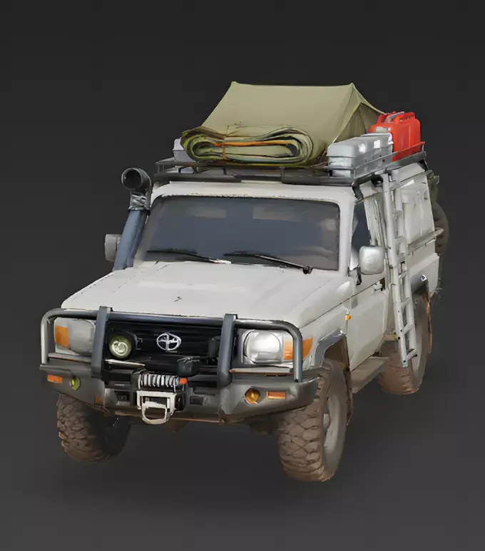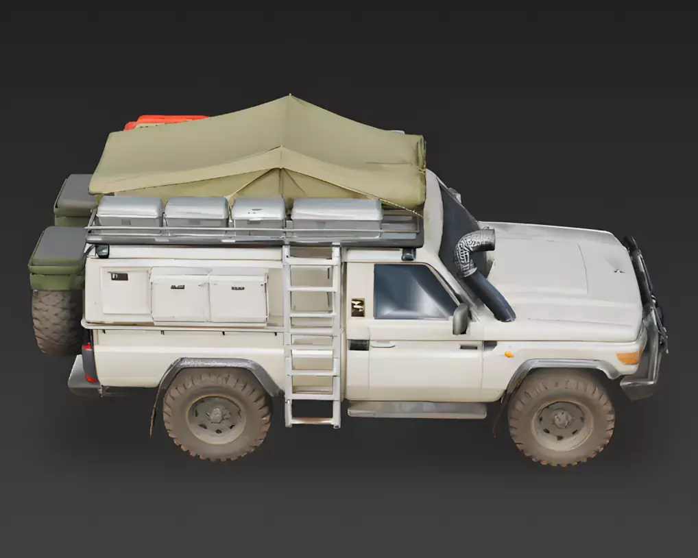 The Overall Concept This model depicts a Toyota Land Cruiser 70-series modified for overlanding. It’s built to look like a self-sufficient mobile base, carrying everything needed to survive far from civilization, from shelter to fuel and storage.