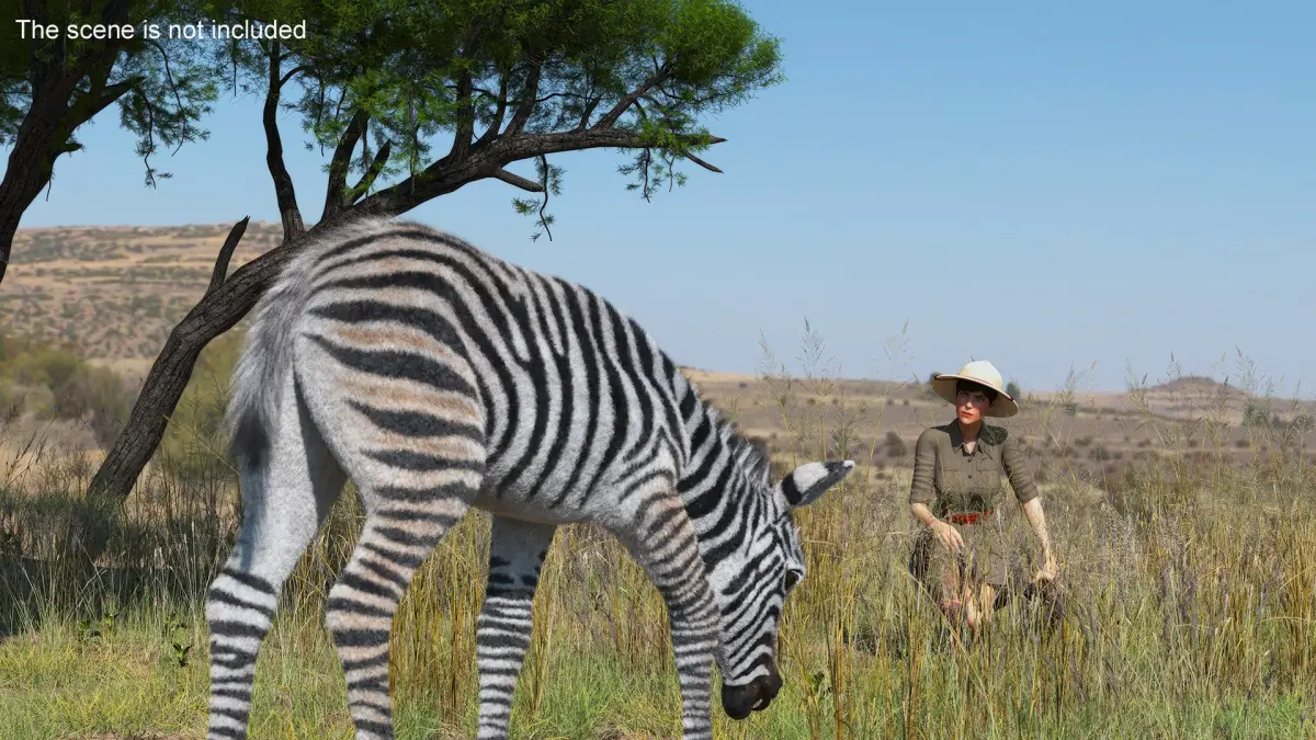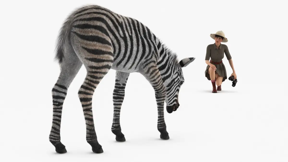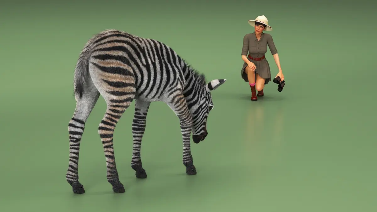 Explorer and Zebra Foal Fur is a three-dimensional model of a wildlife observer interacting with a zebra in a naturalistic scene, perfect for showcasing safari adventures.