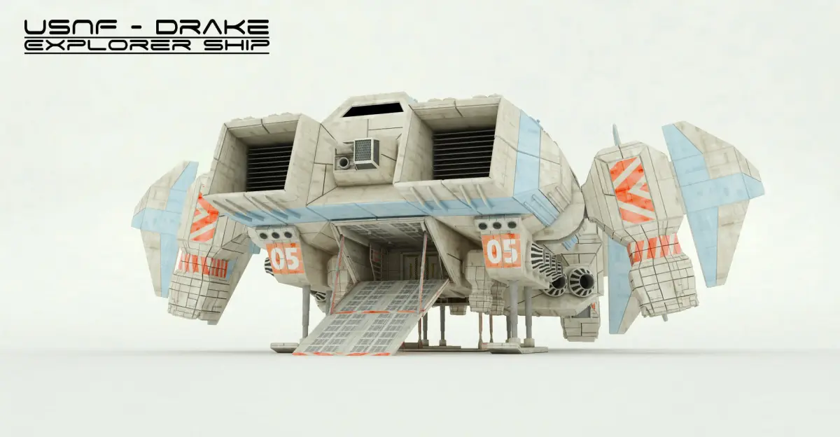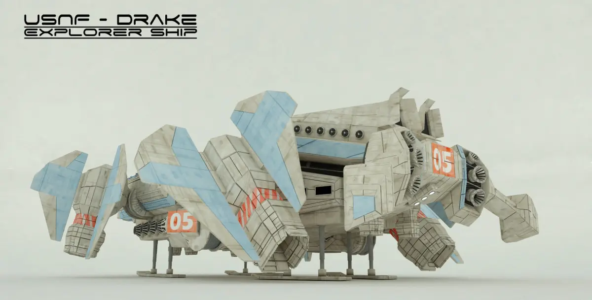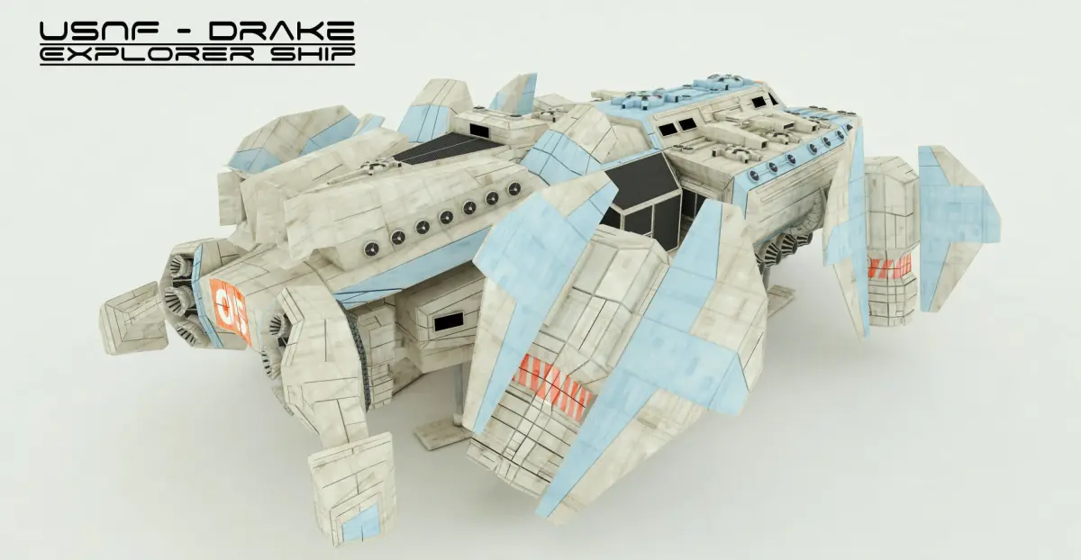 The Drake is named after the famous Earth Explorer. This spacecraft is a highly detailed small 12 crew ship is a long-range spacecraft which as capable of atmospheric landings. The ship has many features and separate parts for animation such as the front ramp, landing struts, main Vertical thrusters, Landing Platform.