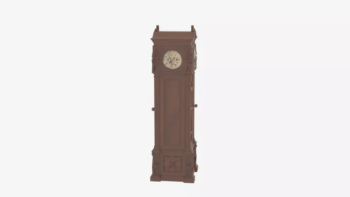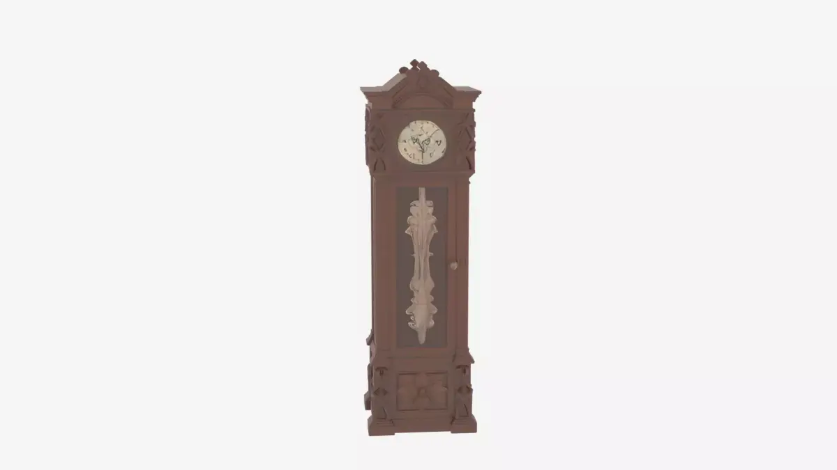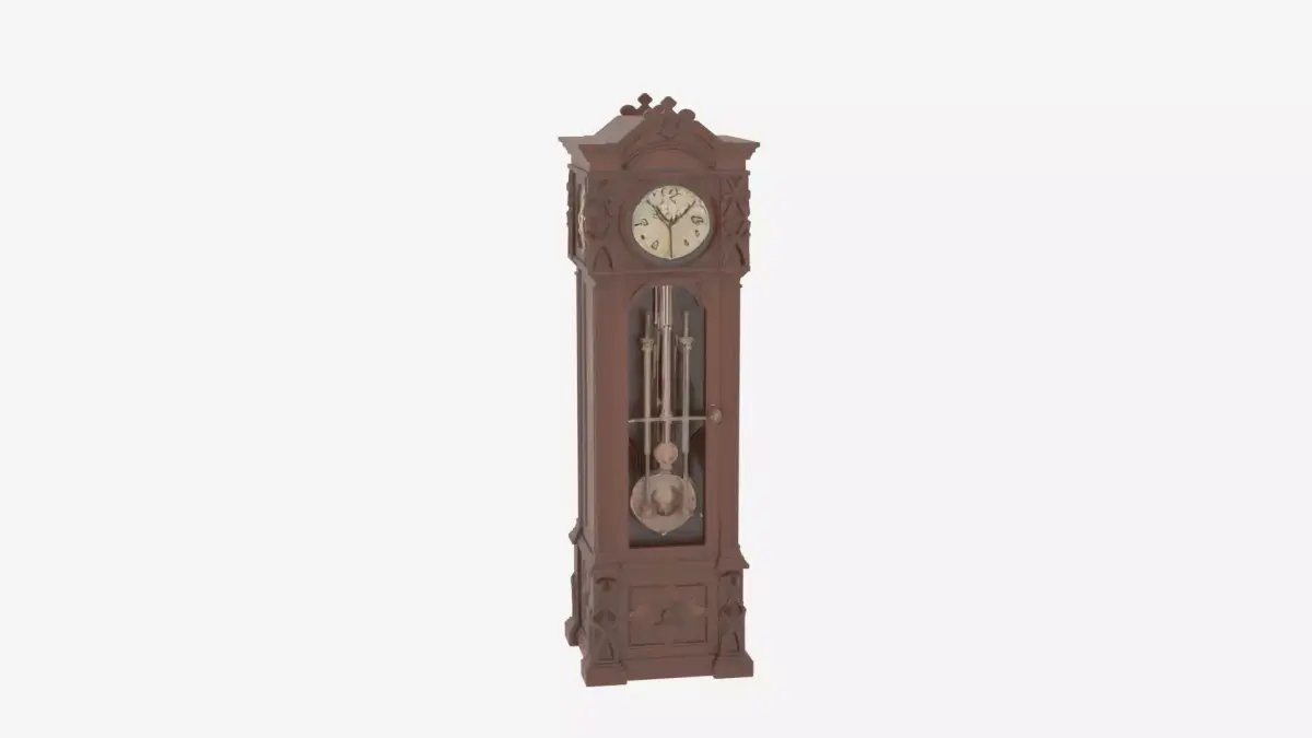 3D model of an elegant grandfather clock in cartoon style, featuring a rich mahogany finish with ornate carvings of wise owls on the sides. The front view showcases a beautifully detailed clock face with Roman numerals and a moon phase dial at the top. The glass door reveals the intricate pendulum mechanism inside. Back view displays the exposed mechanical pendulum with swing animation. Left side highlights the detailed owl carvings with feather textures. Right side focuses on the brass door hinge mechanism. All views rendered on clean white background with soft shadows. Highly detailed textures for game assets, vibrant mahogany wood grain, glass transparency effects, metallic brass accents, and subtle subsurface scattering for the clock face.