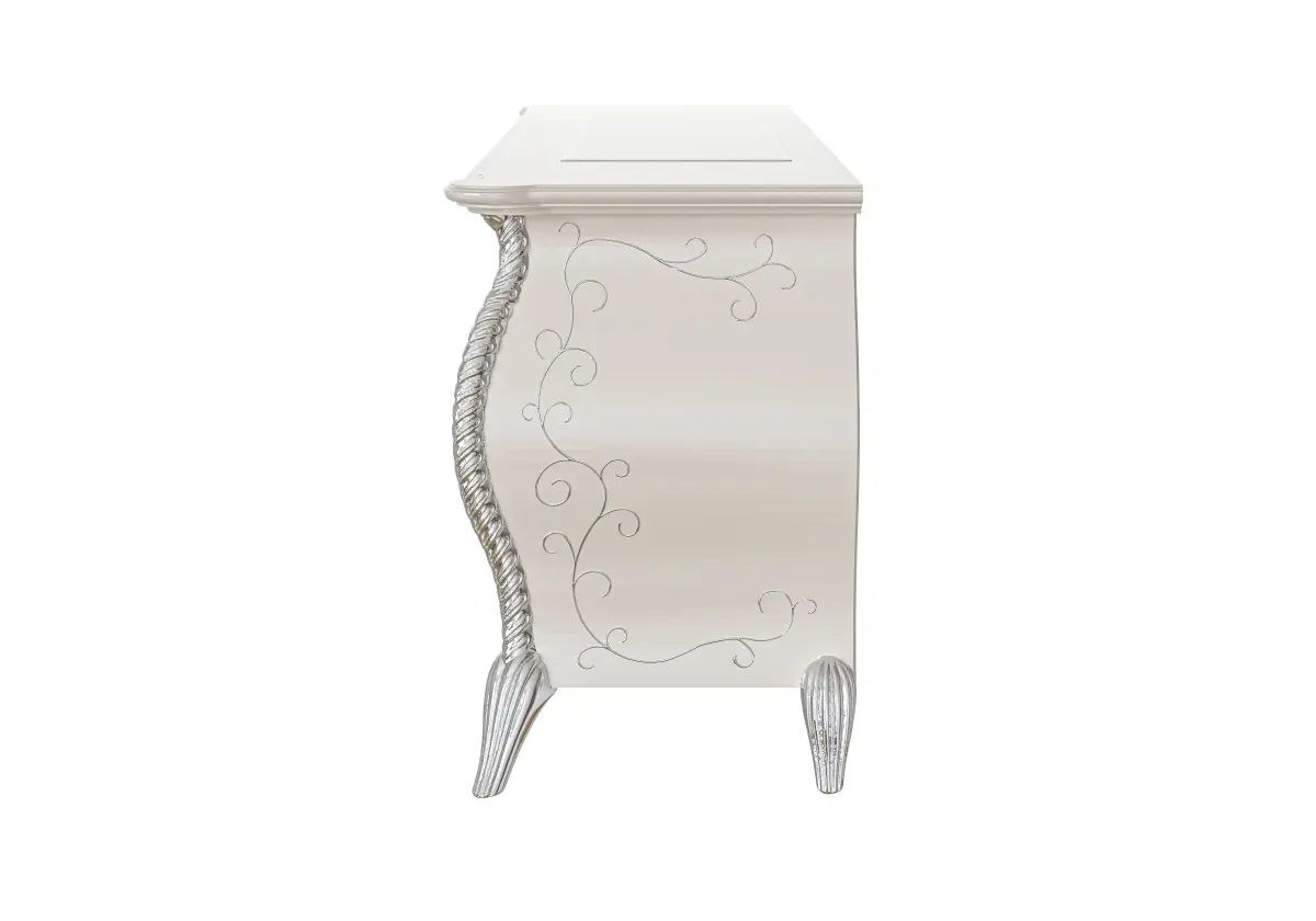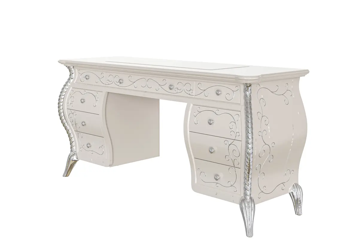 Rococo Design: The dressing table features elaborate curves and intricate detailing, reflecting the opulence of the Rococo period.Luxurious Finish: Crafted from high-quality materials, it boasts a pristine white finish adorned with delicate silver accents and intricate floral motifs.Ample Storage: Equipped with multiple drawers, this table offers generous storage space for your beauty essentials, ensuring a clutter-free area.Artistic Detailing: The ornate carvings and decorative elements highlight the exceptional craftsmanship, making this piece a true work of art.Perfect for those with a taste for luxury and elegance, the Modenese Rococo dressing table is more than just a functional piece of furniture – it’s a statement of style and refinement. Transform your dressing area into a sanctuary of beauty and sophistication with this exquisite table.