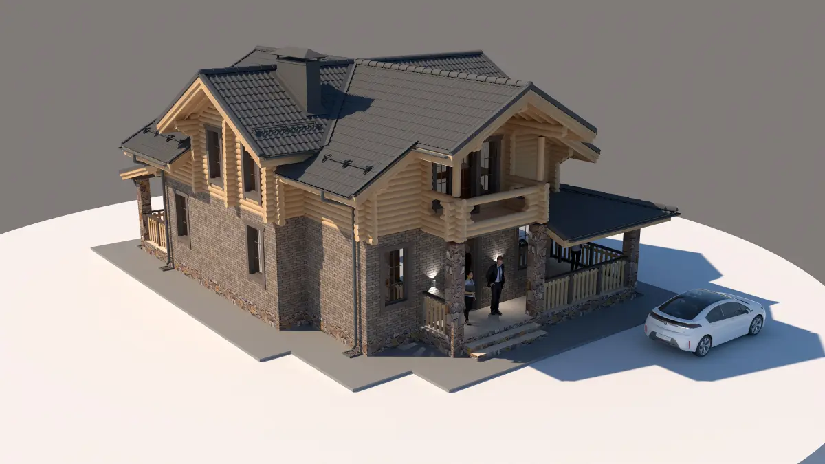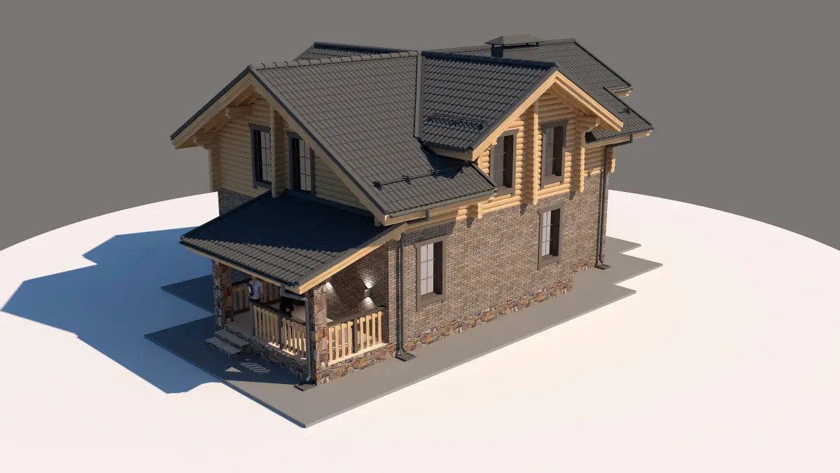 Model of a house with a brick stone first floor and the second of a wooden beam. The roof is made of tiles. The house has a second light, a balcony and a terrace. Two-storey house with 3 bedrooms, kitchen, dining room and living room. Suitable for country life and outdoor recreation. Model of a small house with a compact location on the plot. A detailed overview of the house at the link - https://zen.yandex.ru/media/id/5daf543b118d7f00c3033eca/proekt-kombinirovannogo-doma-150-m2-1yi-etaj-iz-kirpicha-a-2oi-iz-ocilindrovannogo-brevna-240-mm-5fd398fd9480ec78dc900a3f