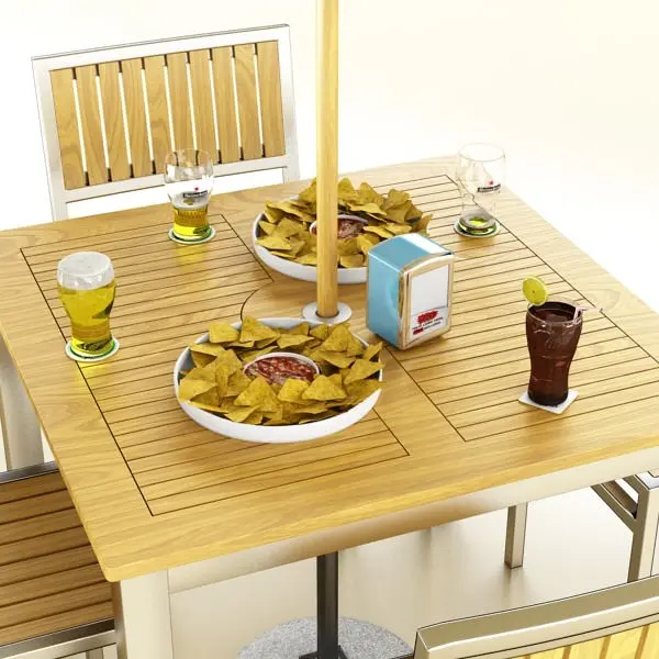 Photorealistic and High Detailed Bar Table, Chair, Parasol, Pint of Beer 3 models, Cola Glass, Nacho Plate, And Napkins Dispenser.