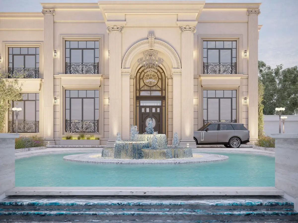 A luxurious neoclassical villa featuring a symmetrical façade with elegant columns, a grand arched entrance, and large glass windows with decorative railings. Soft beige stone finishes, warm exterior lighting, and a central water fountain enhance the villa’s timeless elegance, creating a refined and prestigious appearance.
