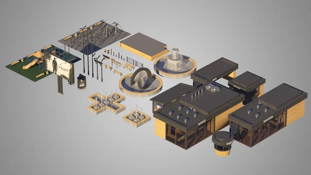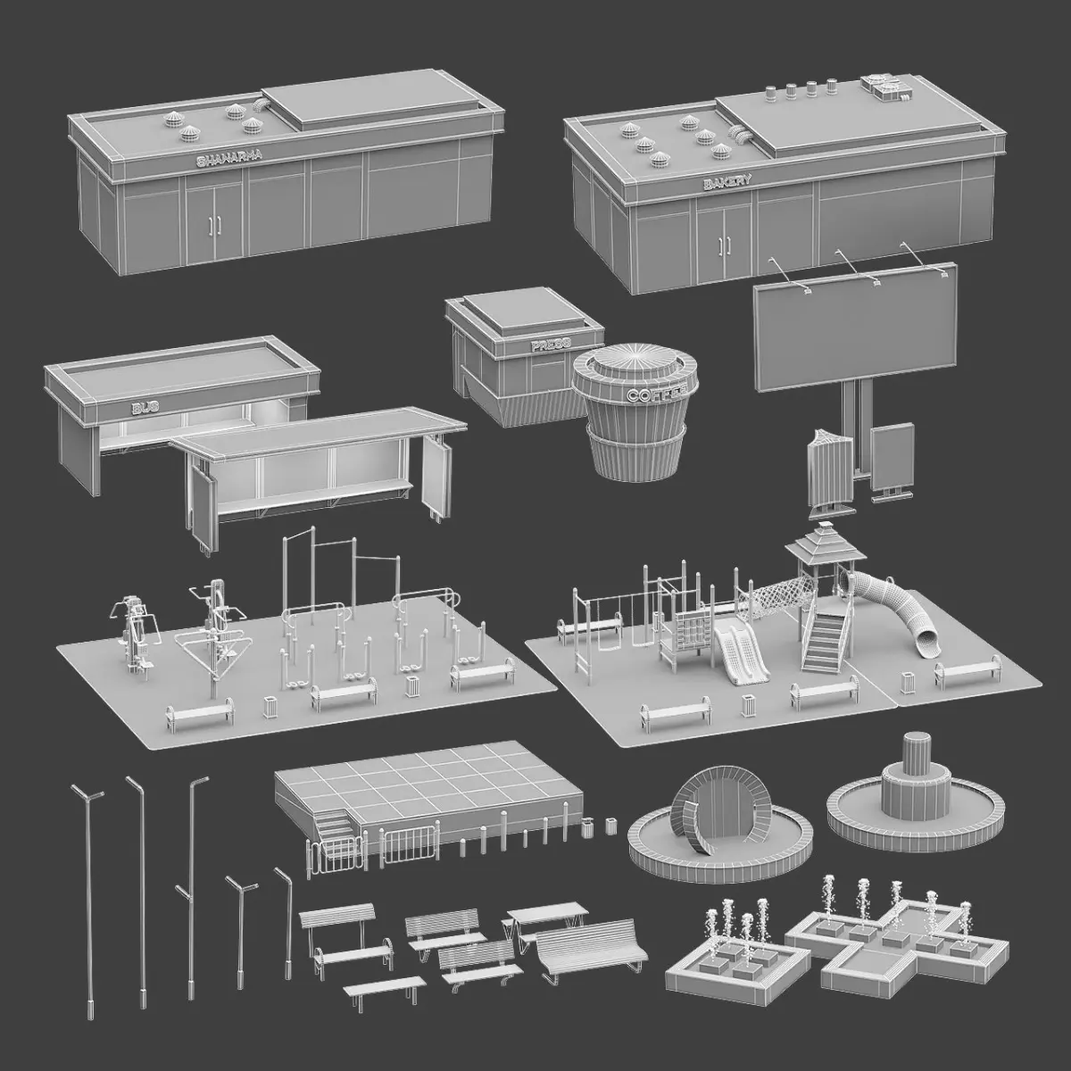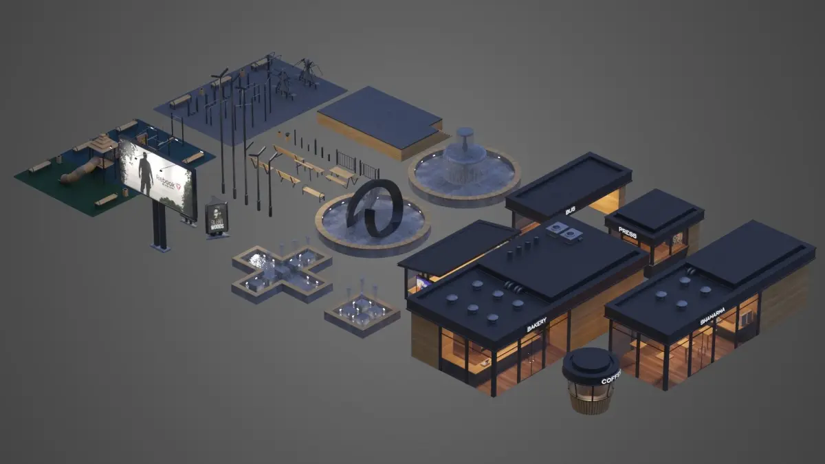 Mid-poly models of exterior objects such as: Bakery, fast food restraunt (shawarma), coffee booth, bus stop, newsstand, four types of fountains, billboard, benches (seven types), street stage (kind of platform), kids playground and sports ground. There are four different scenes: includes Corona and v-ray renders. Both of renders have day and night scenes. Night scenes have switched on light in buildings and fountains, on billboards, lampposts, lightboxes and signboards swiched on too.Have no animations, only still models.