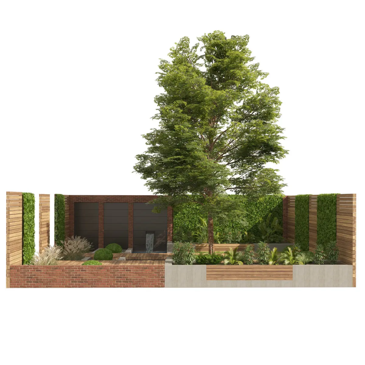 Highly detailed 3d model of garden yard. garden 3d design model contains plants and tree types:1- greenwall hedge plant 3d model.2- sphere topiary bush3- grass4- Chuniophoenix nana Fruit plant5- big grass6- Small palm 7- fern plant8- grass rock9- rock with covered grass10- Decorative grass11- Cortaderia jubata12- Broadleaves tree13- petal palmgraden also has small pool with water fall, wood deck planter and wood bench.Vray exterior scene file has complete cameras set with exterior lights and render setting.