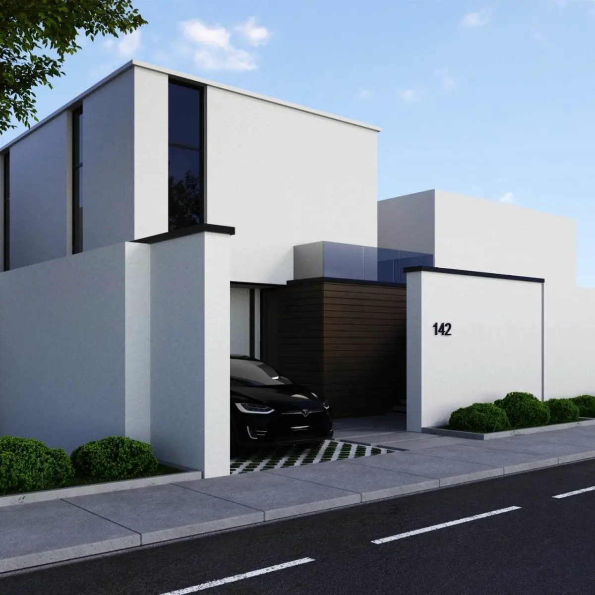 note. note include strees and green parking.In addition to the modern high-tech house, this model file also includes a meticulously designed 3D Tesla car model. The Tesla car exemplifies the pinnacle of electric vehicle technology and embodies the eco-friendly and futuristic values associated with the brand.