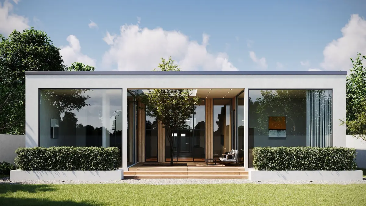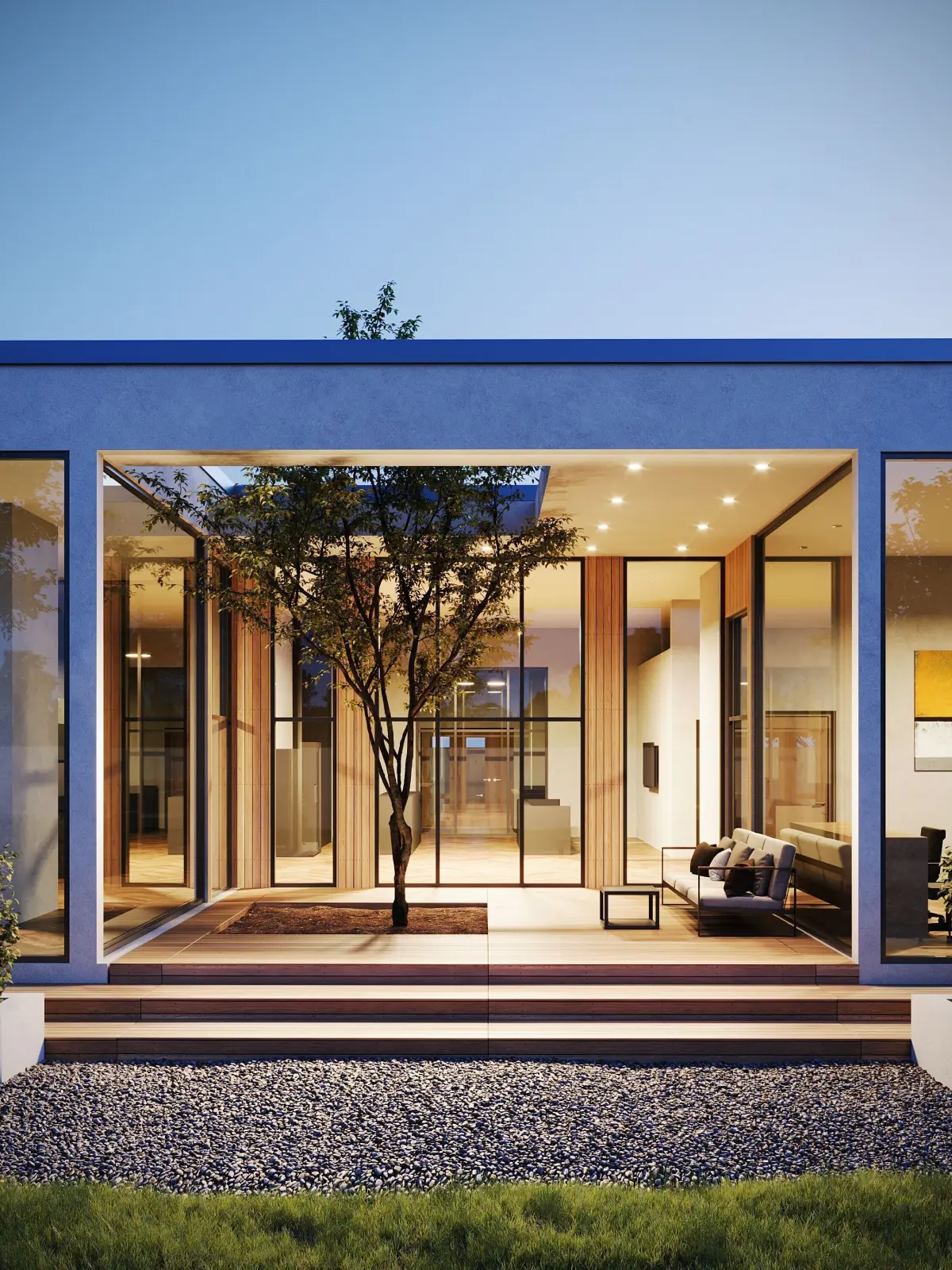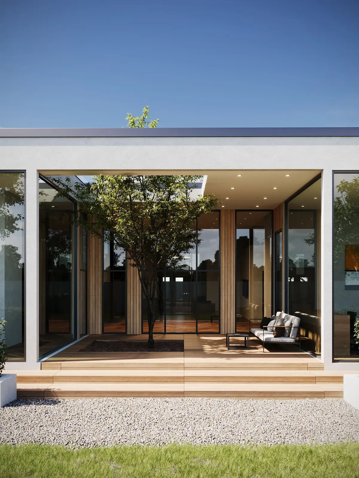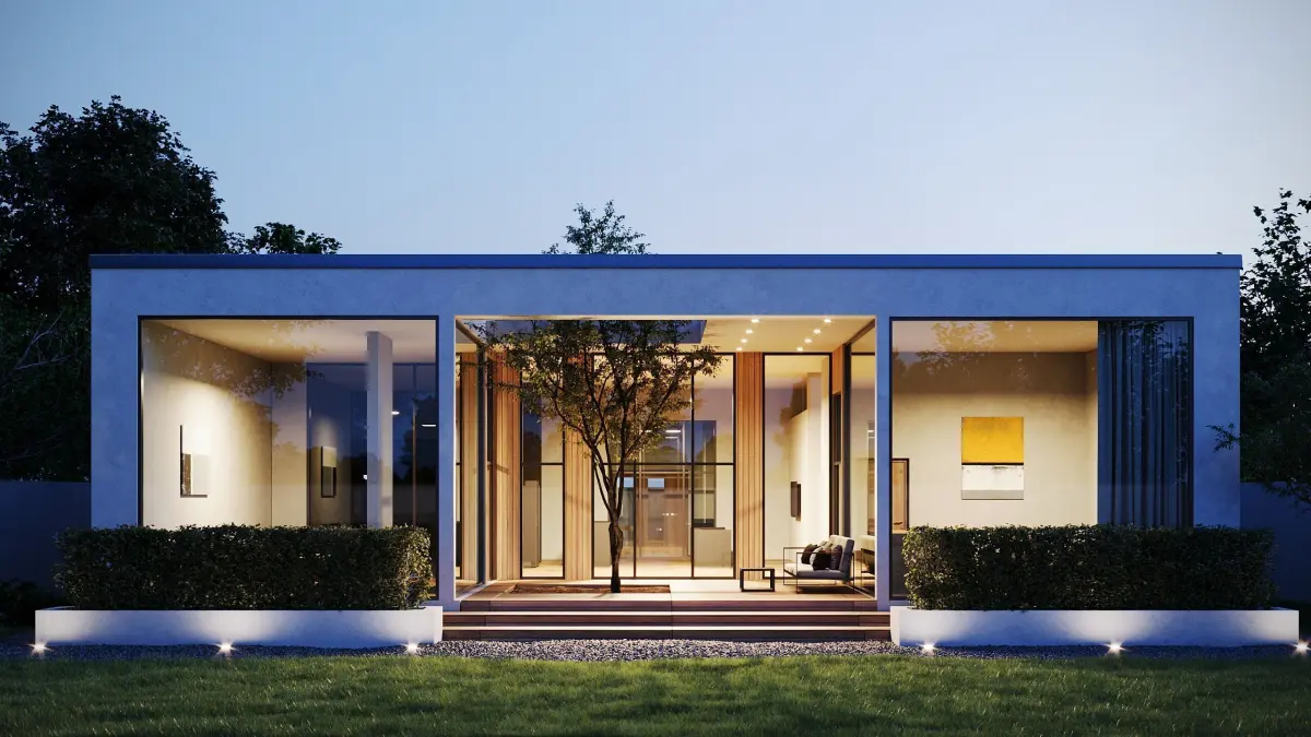This 3D project represents a modern single-story house in a minimalist style with a flat roof and panoramic windows. The central feature of the building is an open patio with a tree, seamlessly connecting indoor and outdoor spaces.